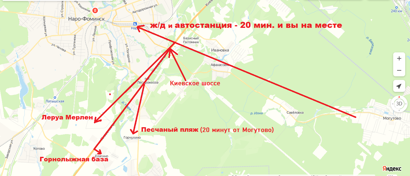 В 20 минутах езды от СНТ расположен песчаный пляж на берегу большого озера в д. «Горчухино» (катамараны, вейкборд, кафе, детская площадка). А для любителей зимнего отдыха в 25 минутах езды от СНТ находится горнолыжная база «Елагино». Устойчивый сигнал всех сотовых операторов связи, проводной (оптоволокно) интернет от Наро-Фоминского провайдера на территории СНТ, можно подключиться.