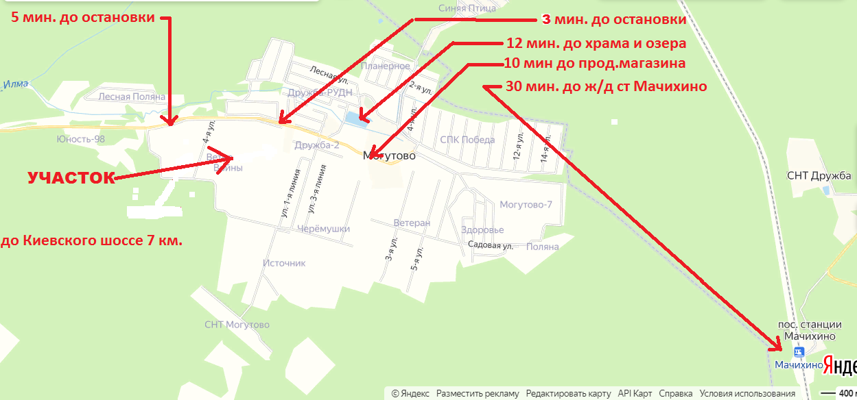 Круглогодичный проезд (в СНТ есть собственная уборочная техника), дорога до СНТ хорошая асфальтированная, на территории асфальтовая крошка, охрана, проезд через шлагбаум, общее ограждение массива, на территории детская и спортивная площадки, гостевая парковка. СНТ считается самым благоустроенным в этом районе, до продуктового магазина 10 мин. пешком, до остановки общественного транспорта 3 минут ходьбы, автобус ходит до г. Наро-Фоминска, где есть ВСЯ инфраструктура.