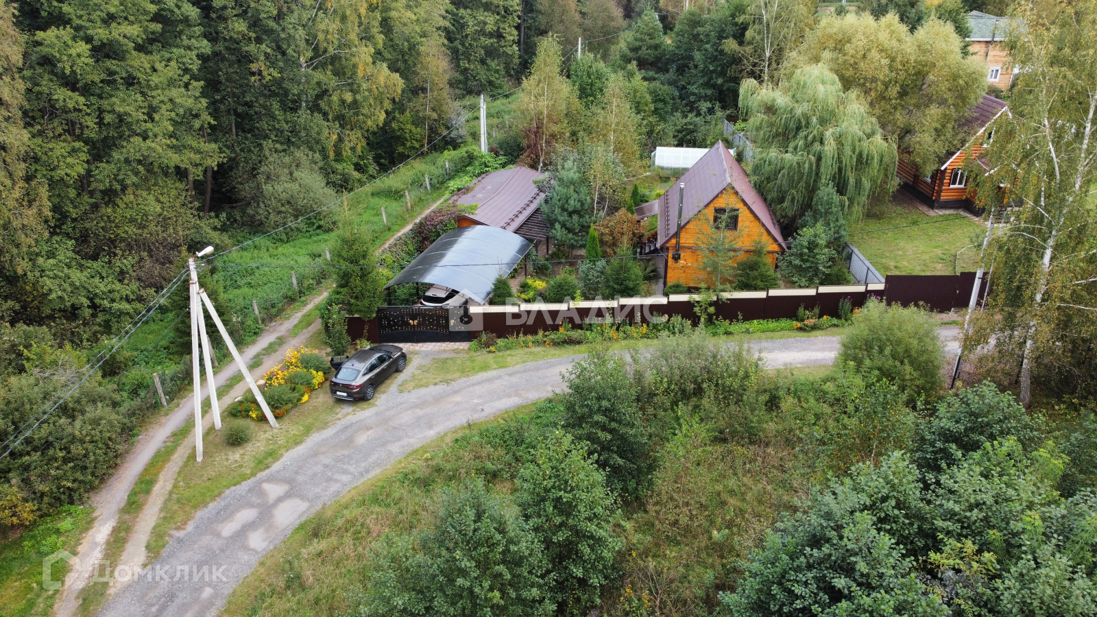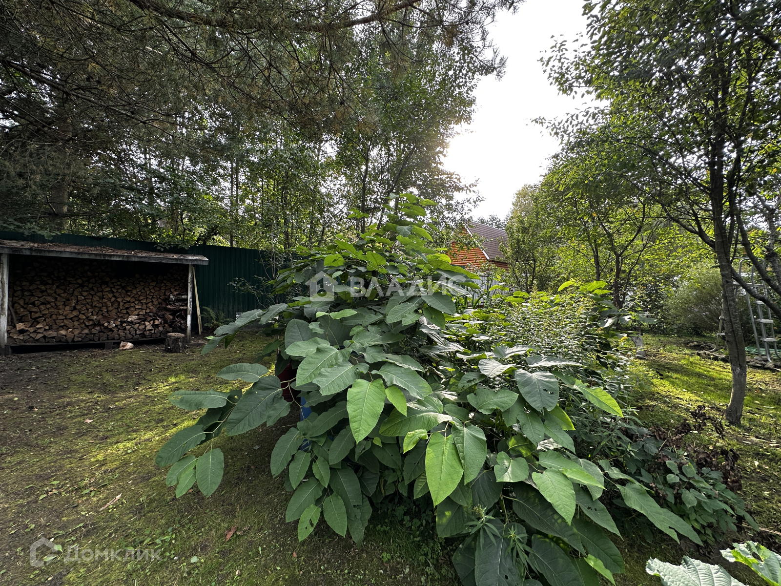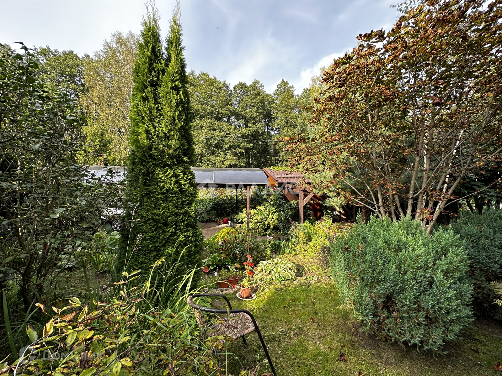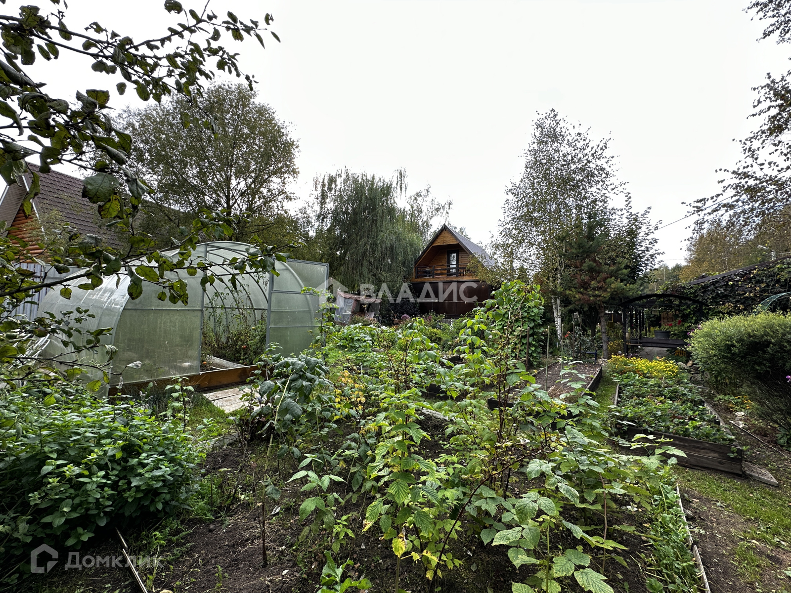 Удачное расположение - участок угловой. При въезде есть навес под машину. На участке много плодовых деревьев и кустарников, растут ягоды, овощи. Есть дровница, теплица.