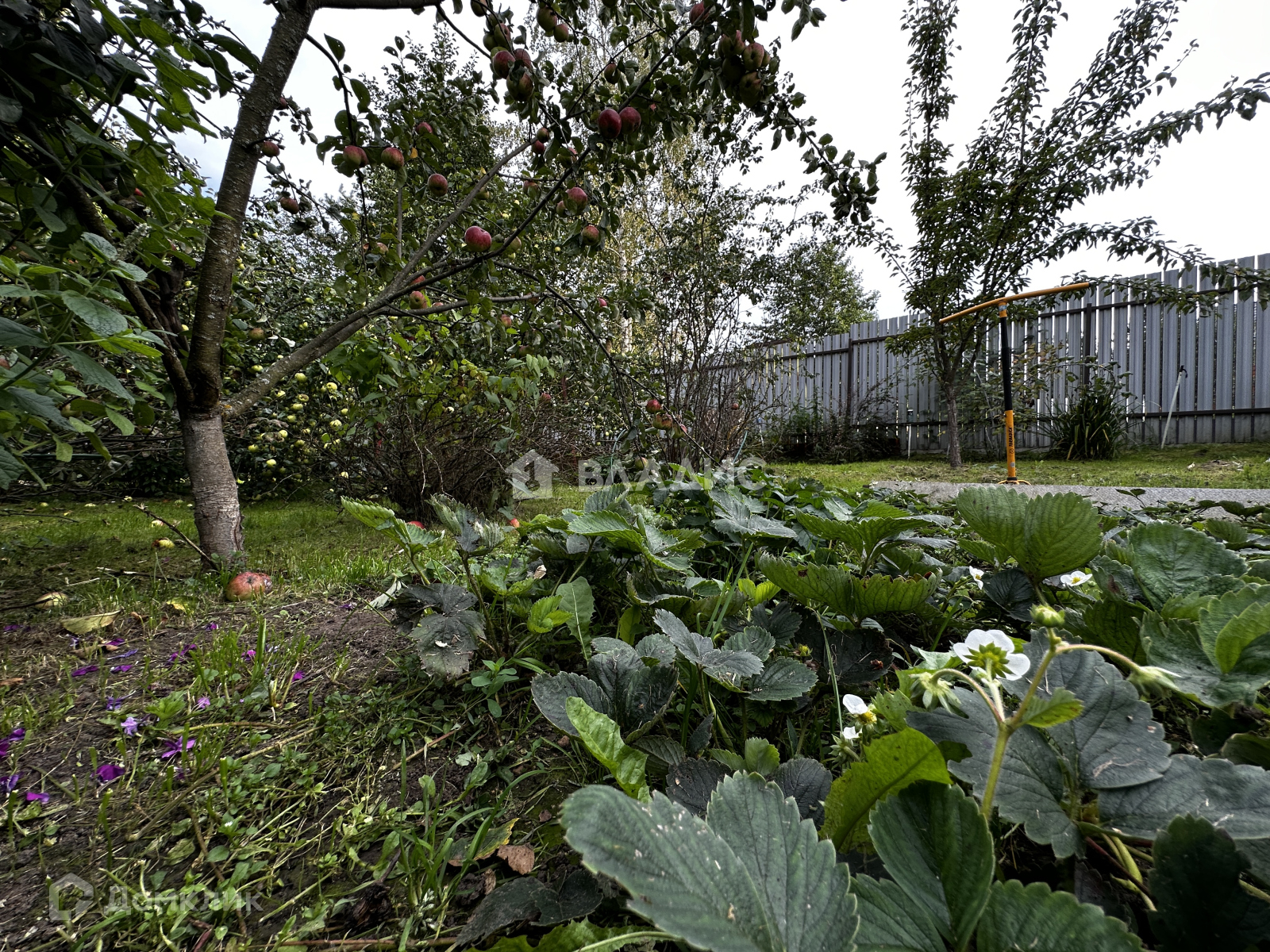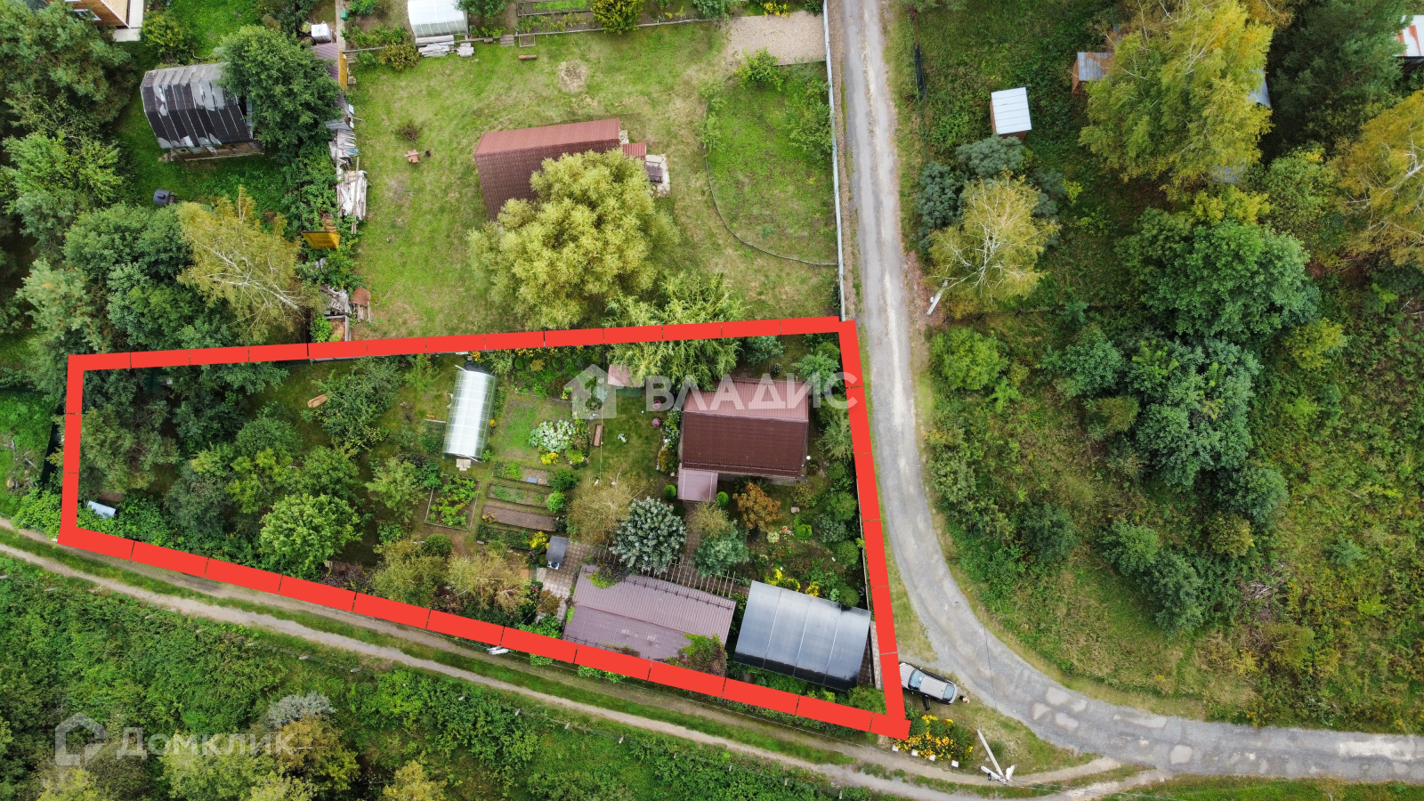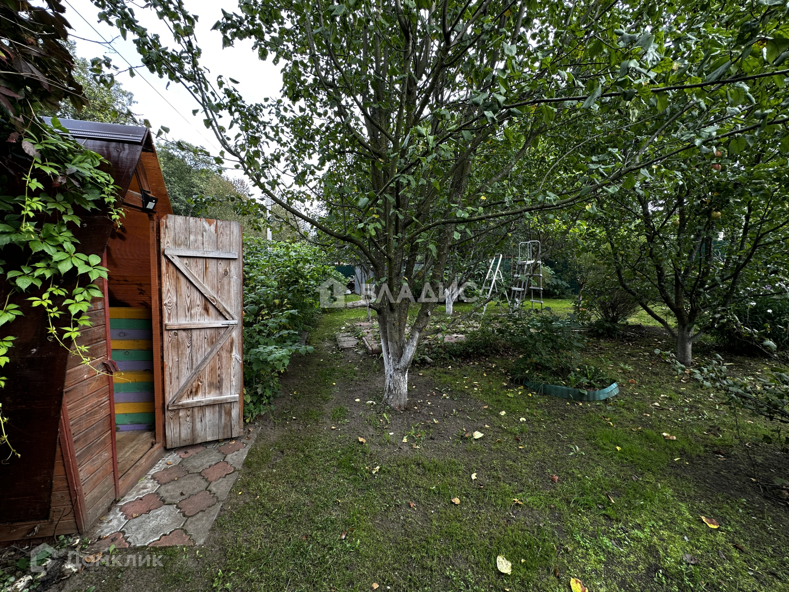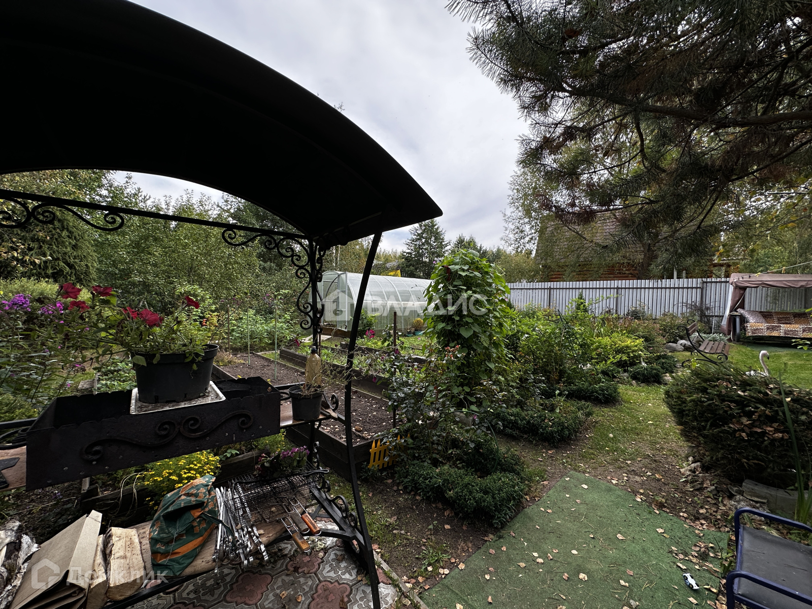 Удачное расположение - участок угловой. При въезде есть навес под машину. На участке много плодовых деревьев и кустарников, растут ягоды, овощи. Есть дровница, теплица.