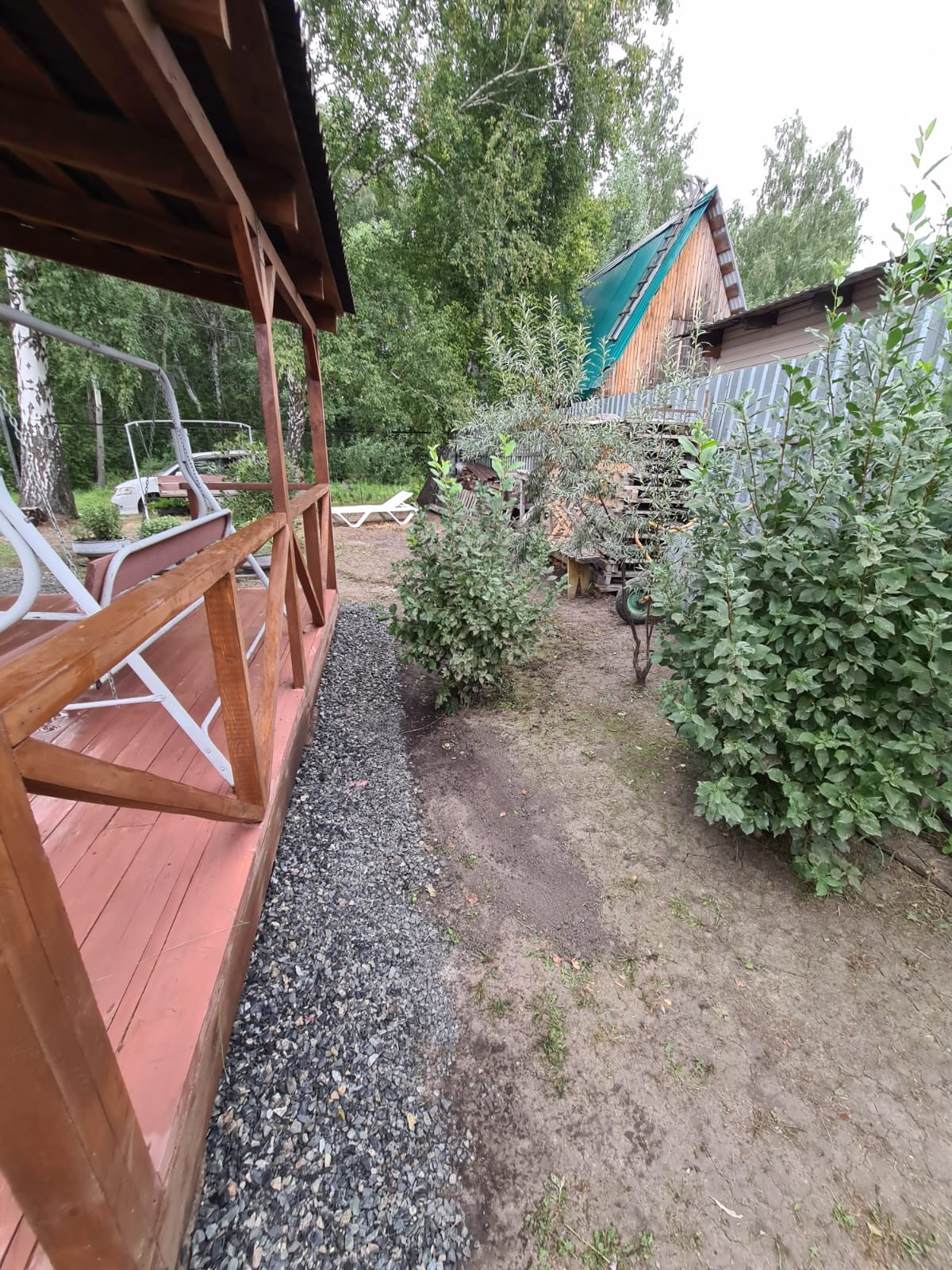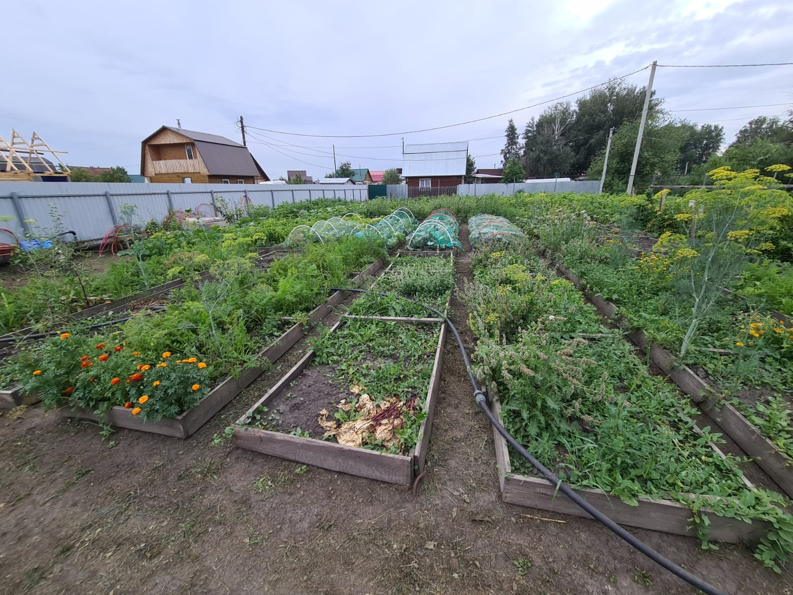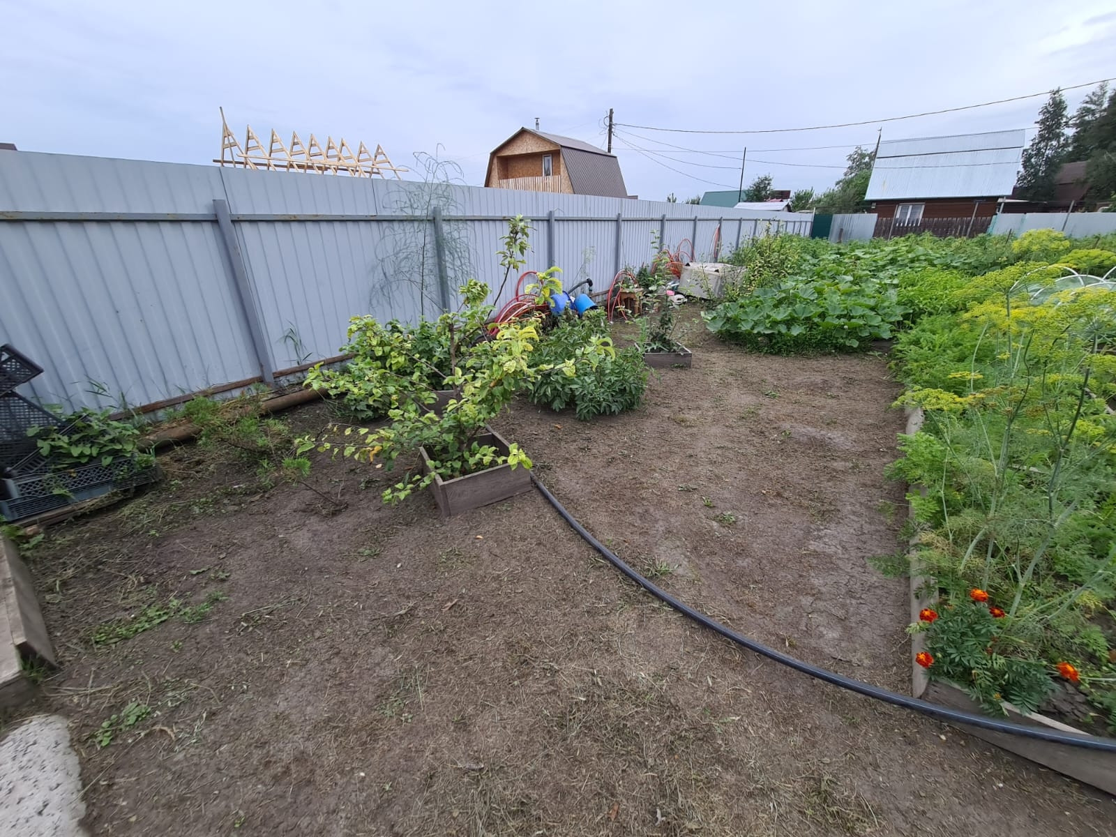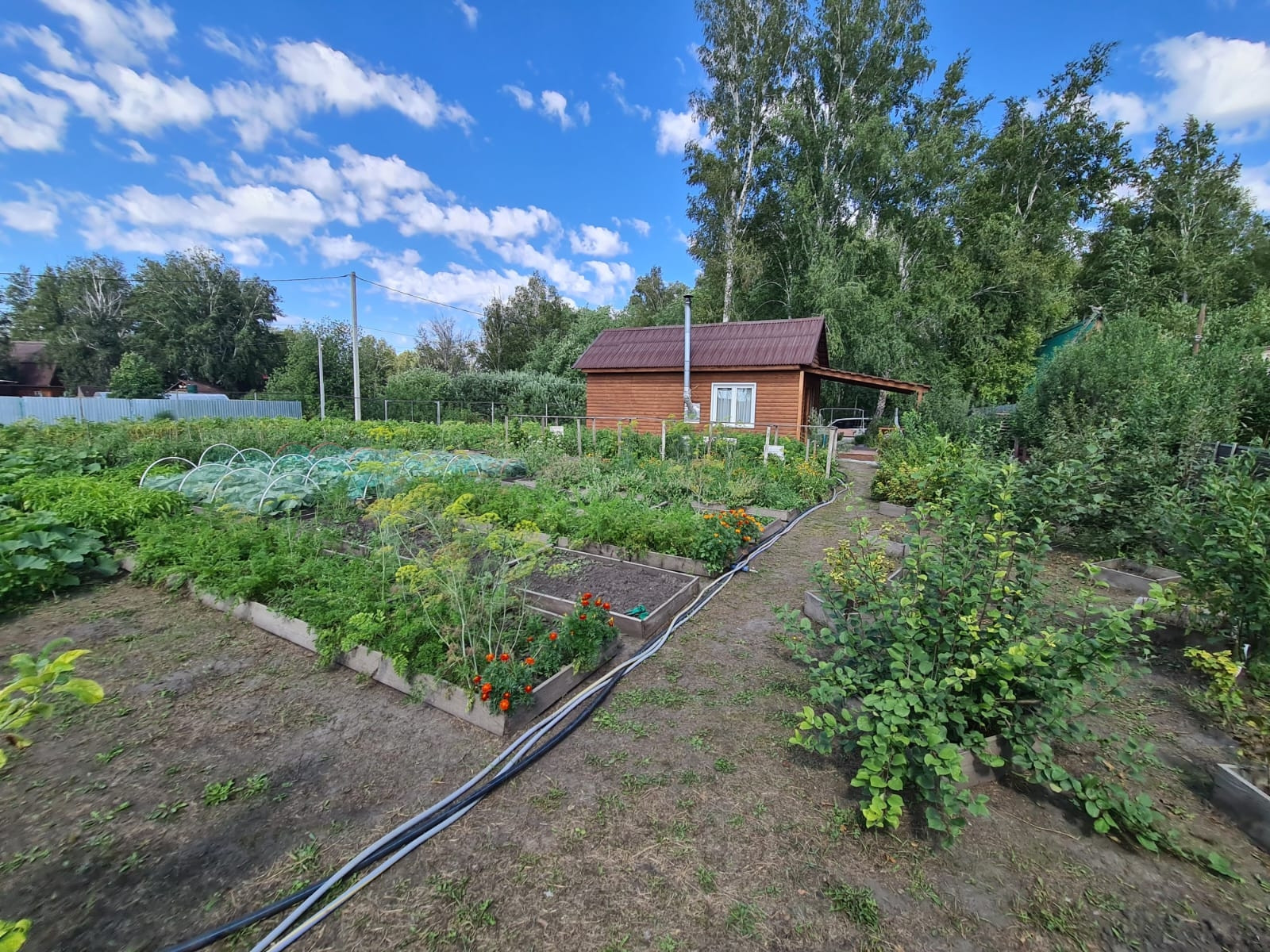 На участке посажены плодовые деревья, яблони, груши, слива, кустарники жимолости, смородины, крыжовник, вишня, облепиха. Грядки сделаны коробами для удобства полива и обработки. Огород вспахивается местным трактором, есть отдельные ворота для заезда техники.