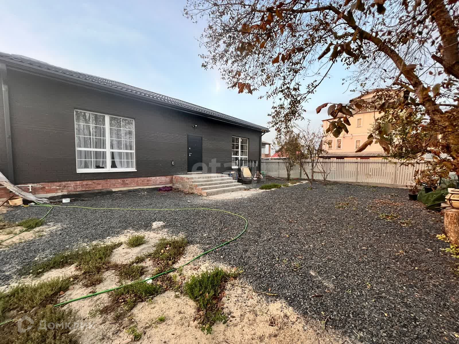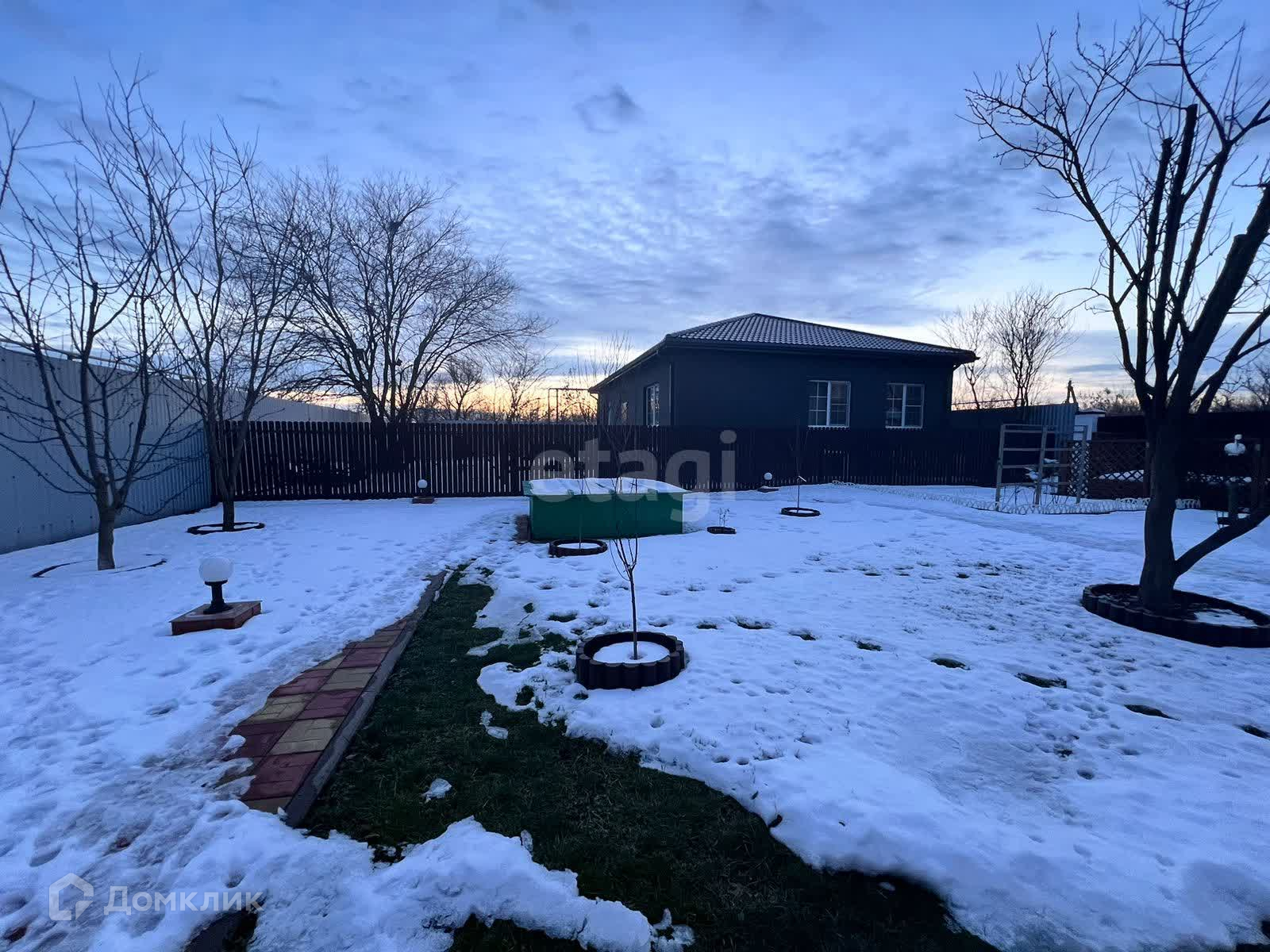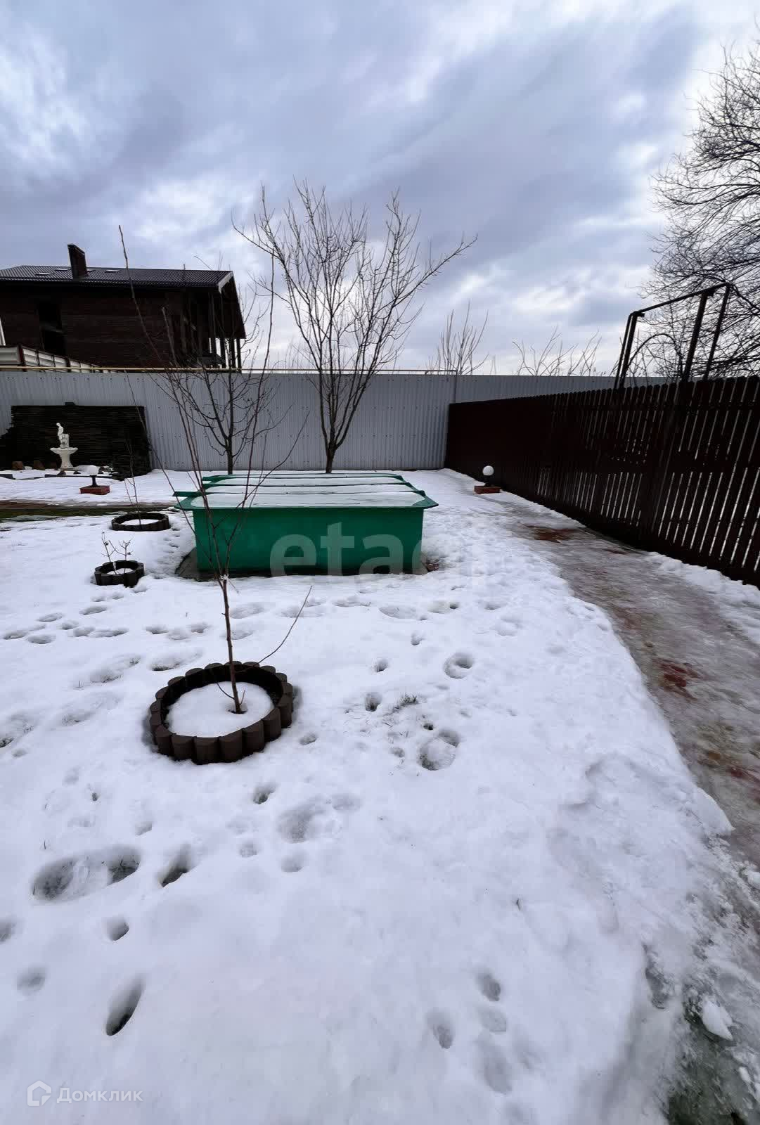 Сад : одна часть участка облагорожена плиткой , плодовые деревья и зона фонтана вторая засыпана щебнем, вольер для собак