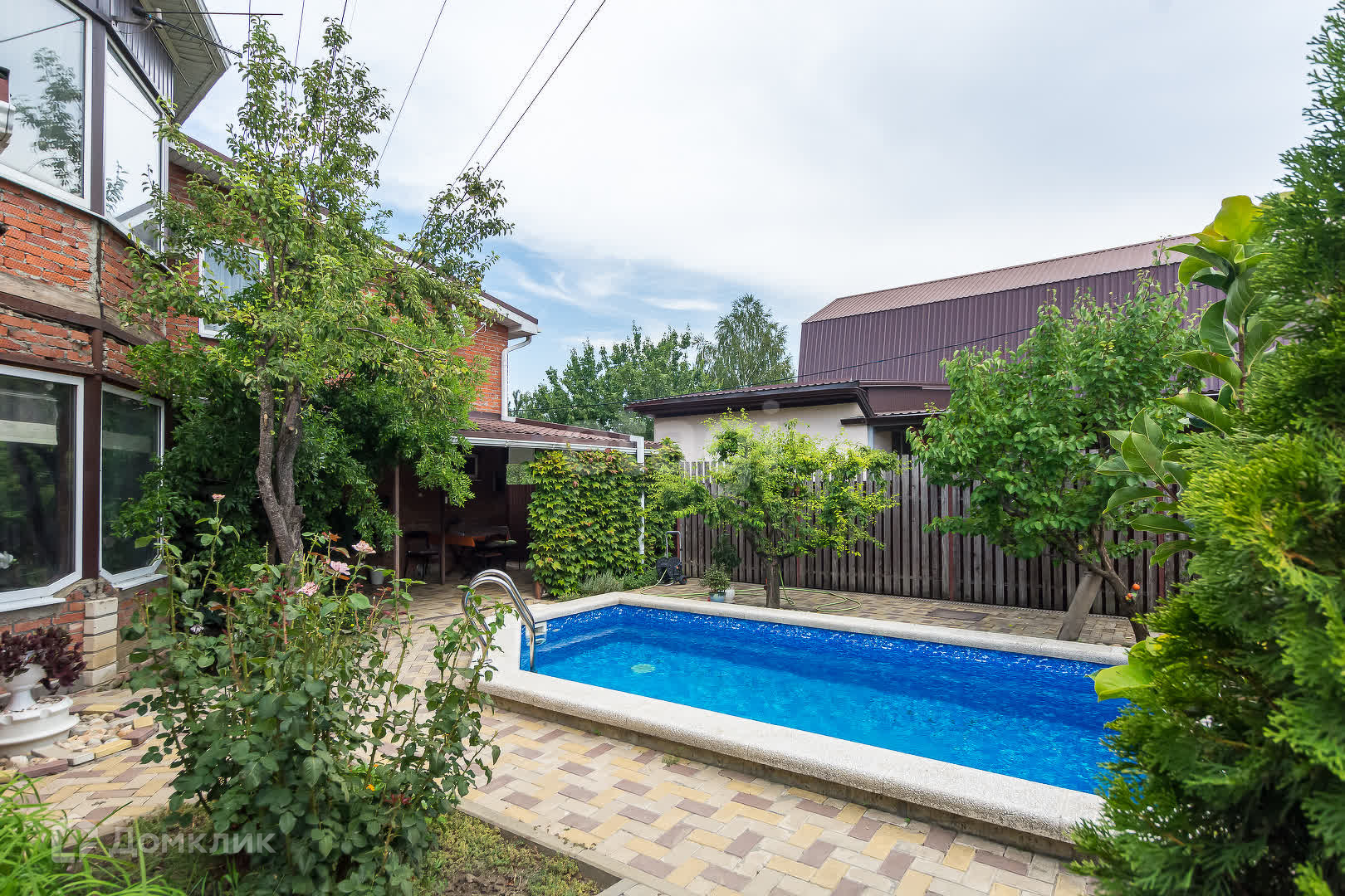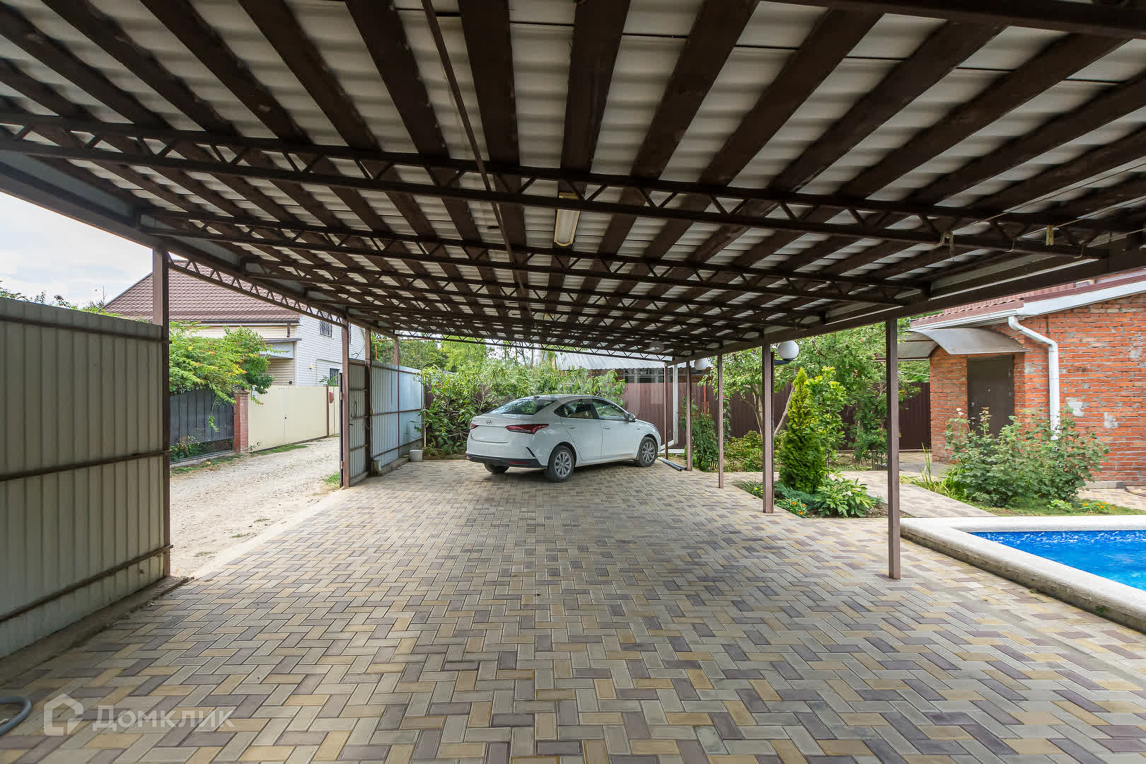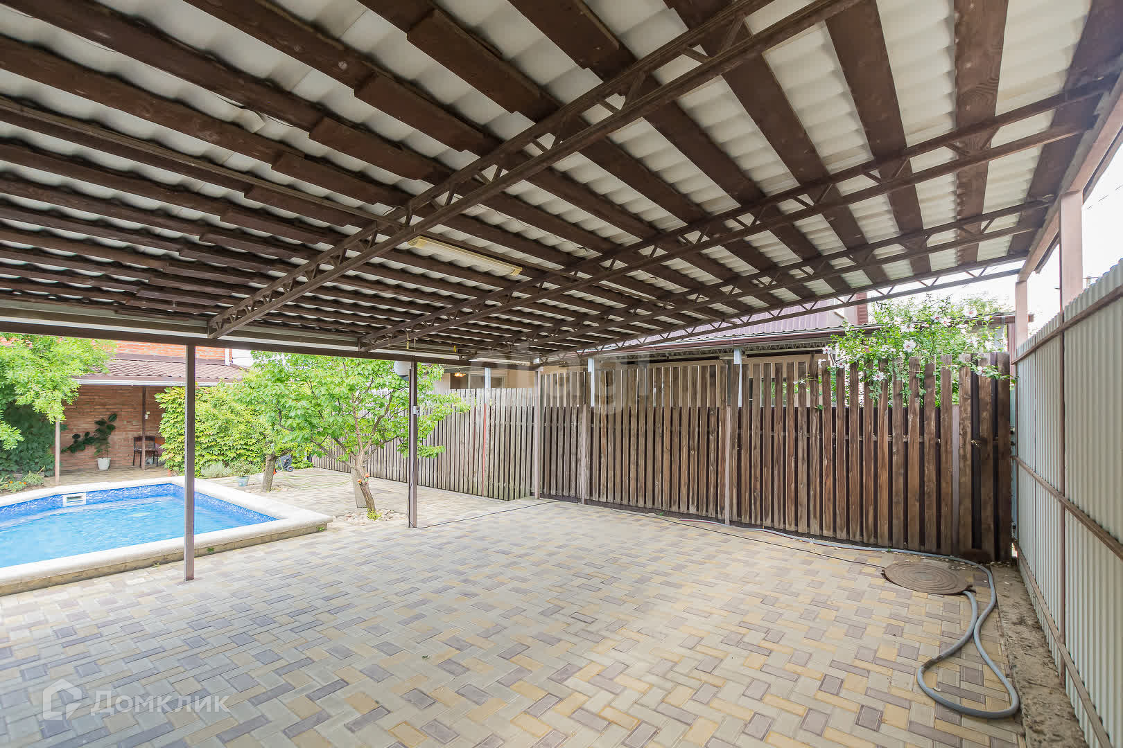 Благоустроенный двор: бассейн на 30 кубов с зеркалом воды 1.55 м2. ,навес рассчитанный на 4 машины и благоустроенный сарай под садовый инвентарь.