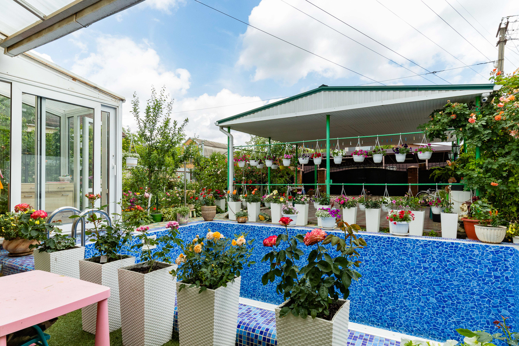 На территории двора размещен капитальный бассейн (6*4 м, глубиной 3 м) с системой фильтрации и подогревом от газового котла. Так же, для любителей попариться есть сауна.