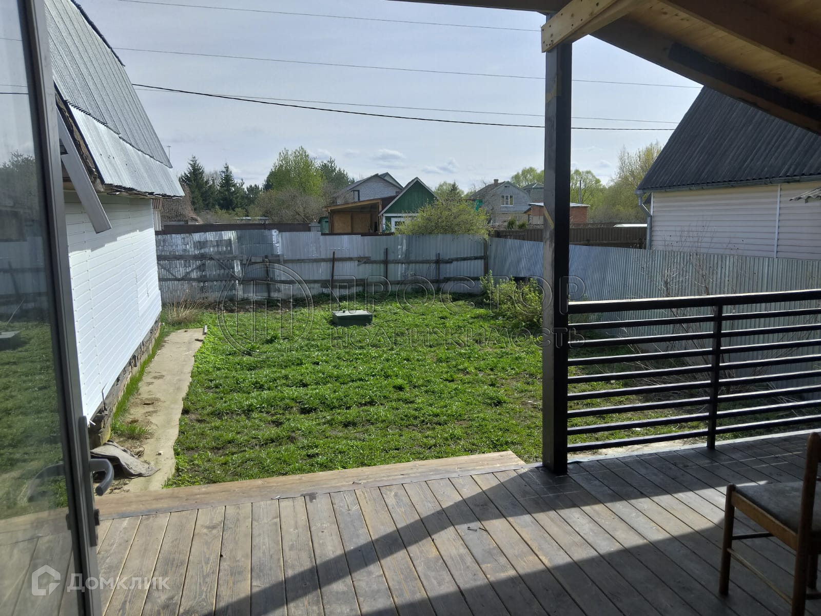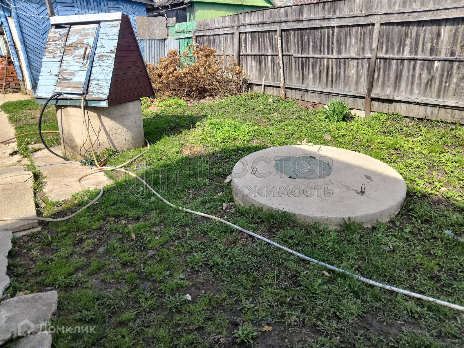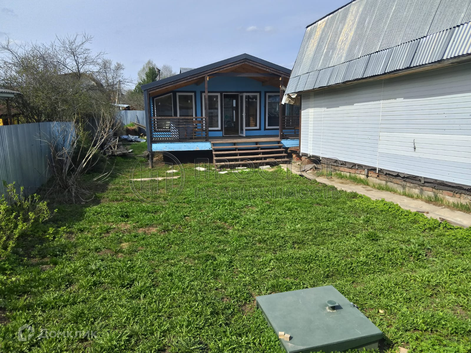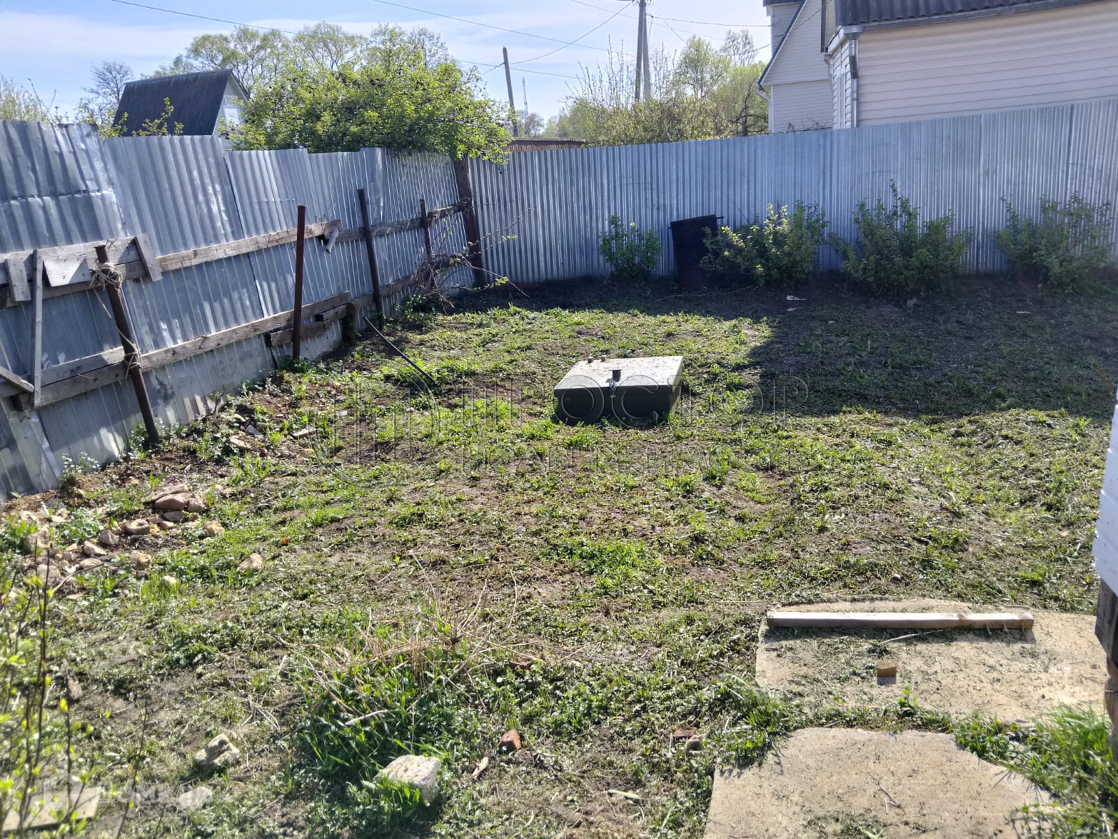 Коммуникации: электричество - 5 кВт, вода - колодец и скважина, канализация - септик (топас). Забор по фасаду из профлиста.