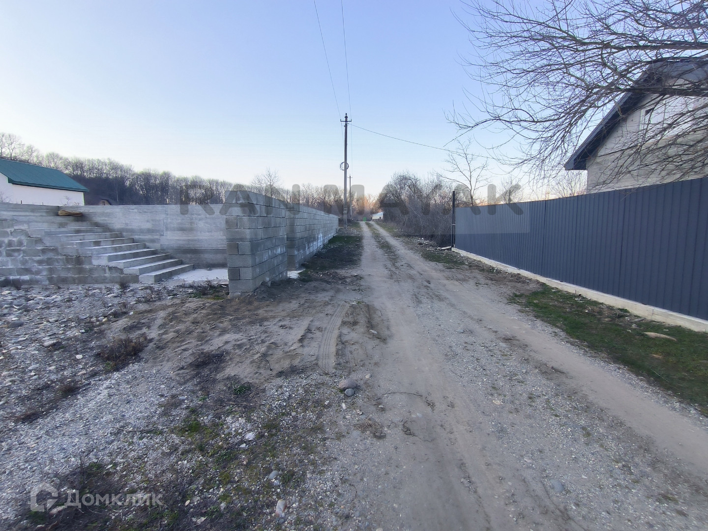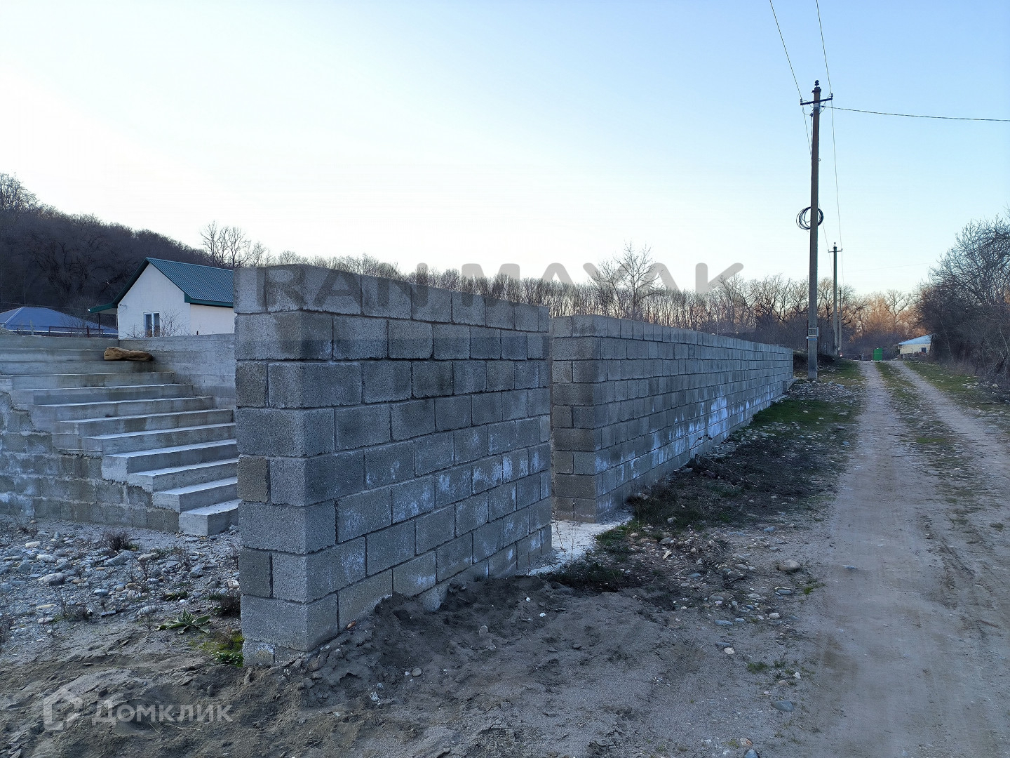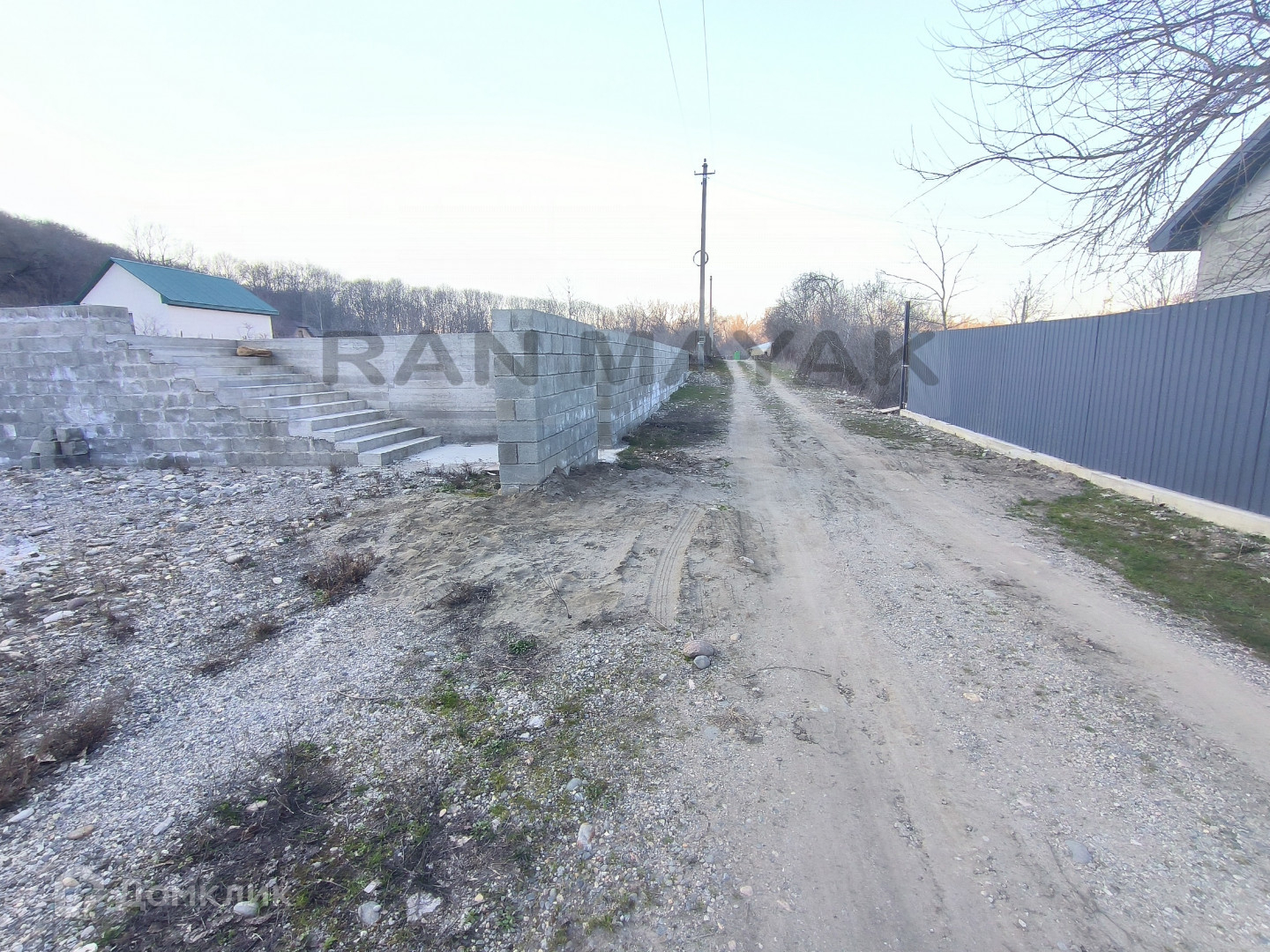 Расположен на высоком месте,  за счет чего очень красивый обзор вокруг. Вся линия вдоль забора укреплена блоками, сделана подпорная стена.
