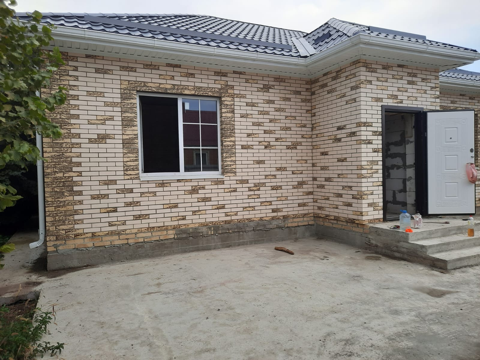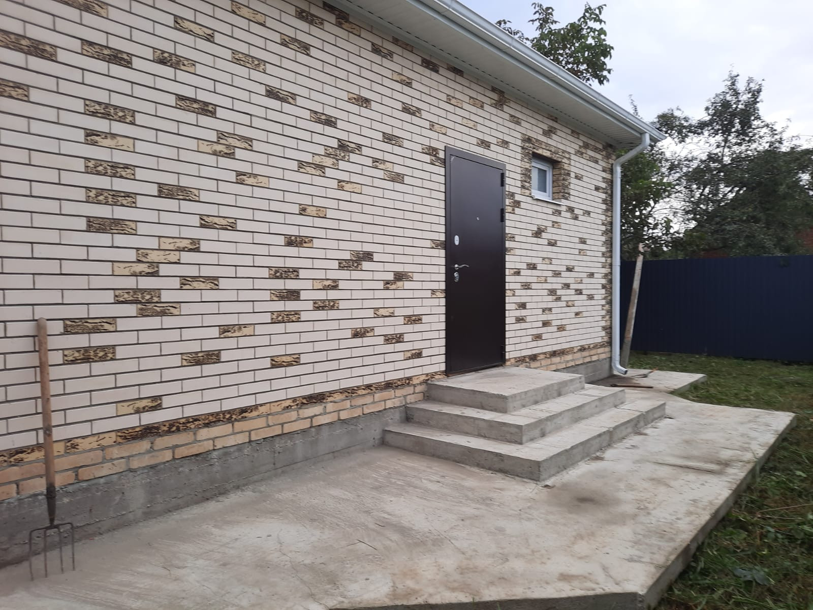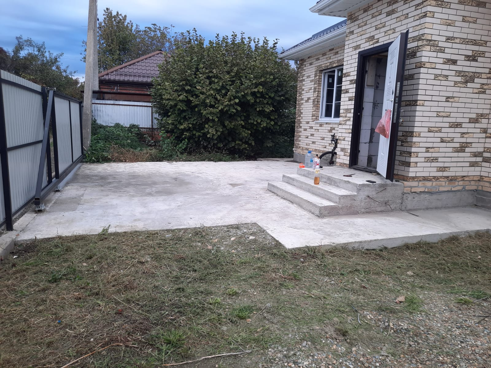 Во дворе залита бетонная площадка для авто, метровая отмостка вокруг дома.