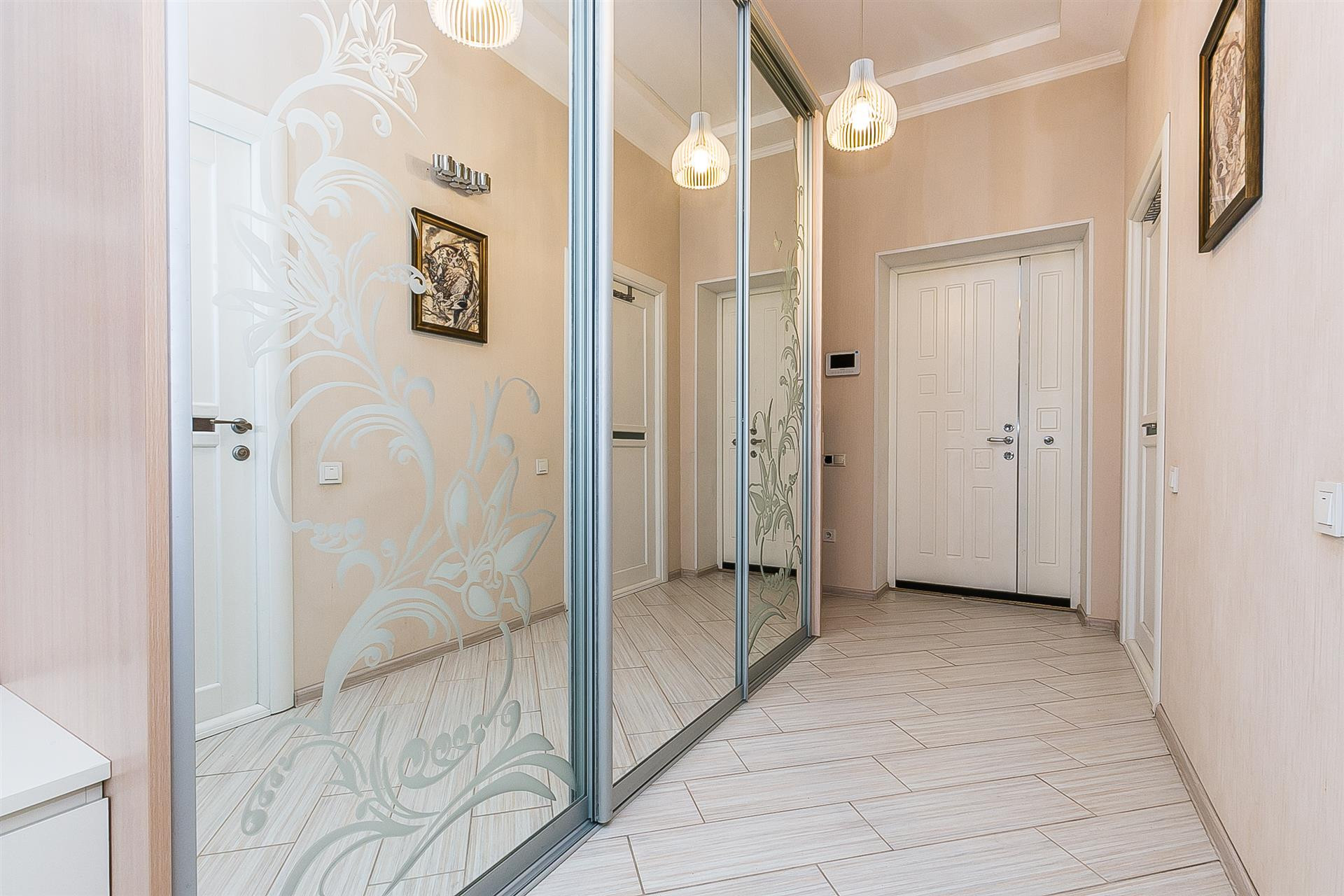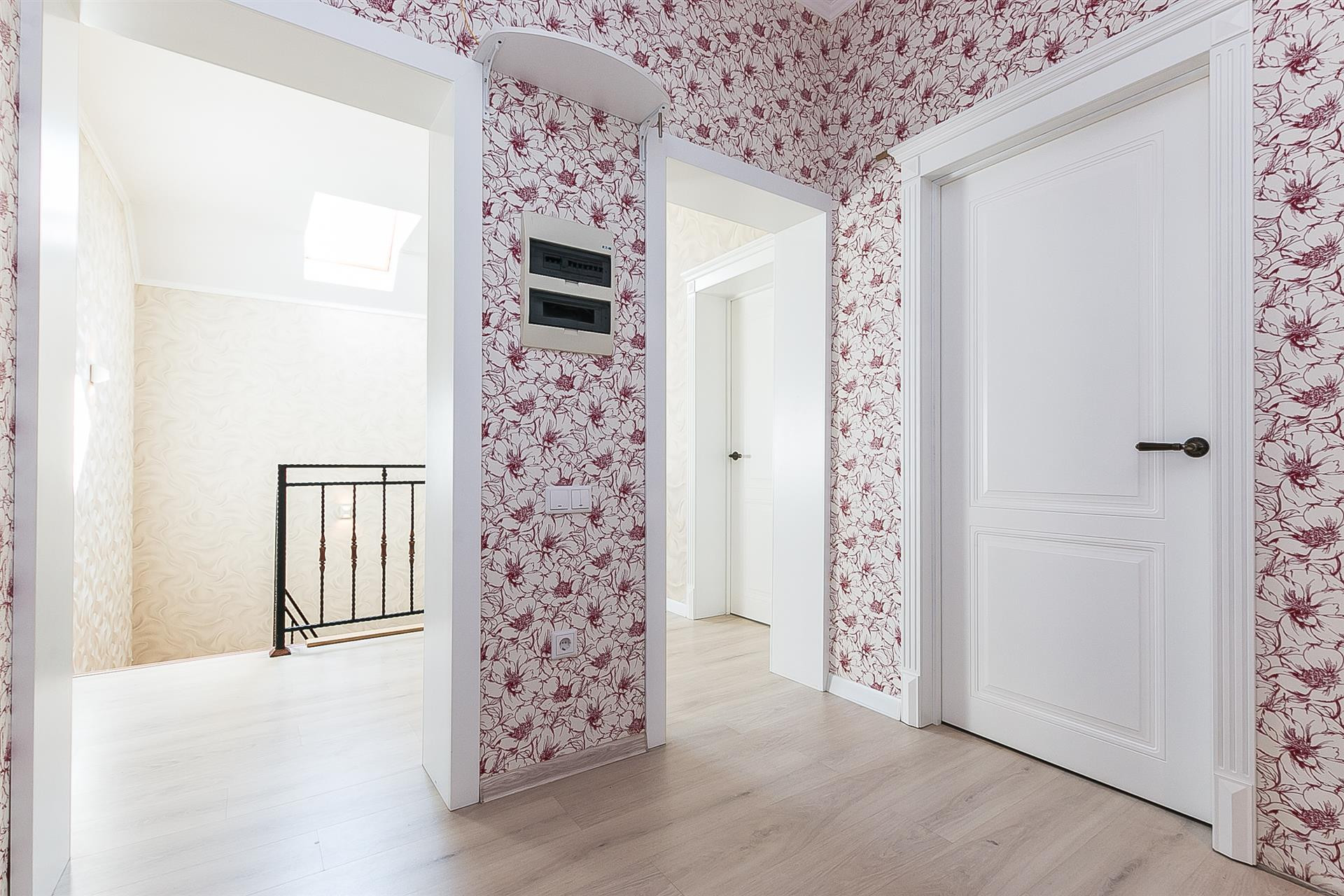 На первом этаже: (по всей площади- теплые полы)- коридор, прихожая со встроенным шкафом, спальня, санузел, кухня-столовая 37 кв.м. с выходом на открытую террасу. Широкая, удобная лестница на второй этаж, где расположены: просторная гардеробная, три изолированные комнаты и, ещё - два отдельных, полноценных санузла. Во всем доме выполнен качественный ремонт. Выходя на террасу, Вы попадаете в зону барбекю с небольшим, плодоносящим садом. Газ, вода, свет 15квт- центральные.
