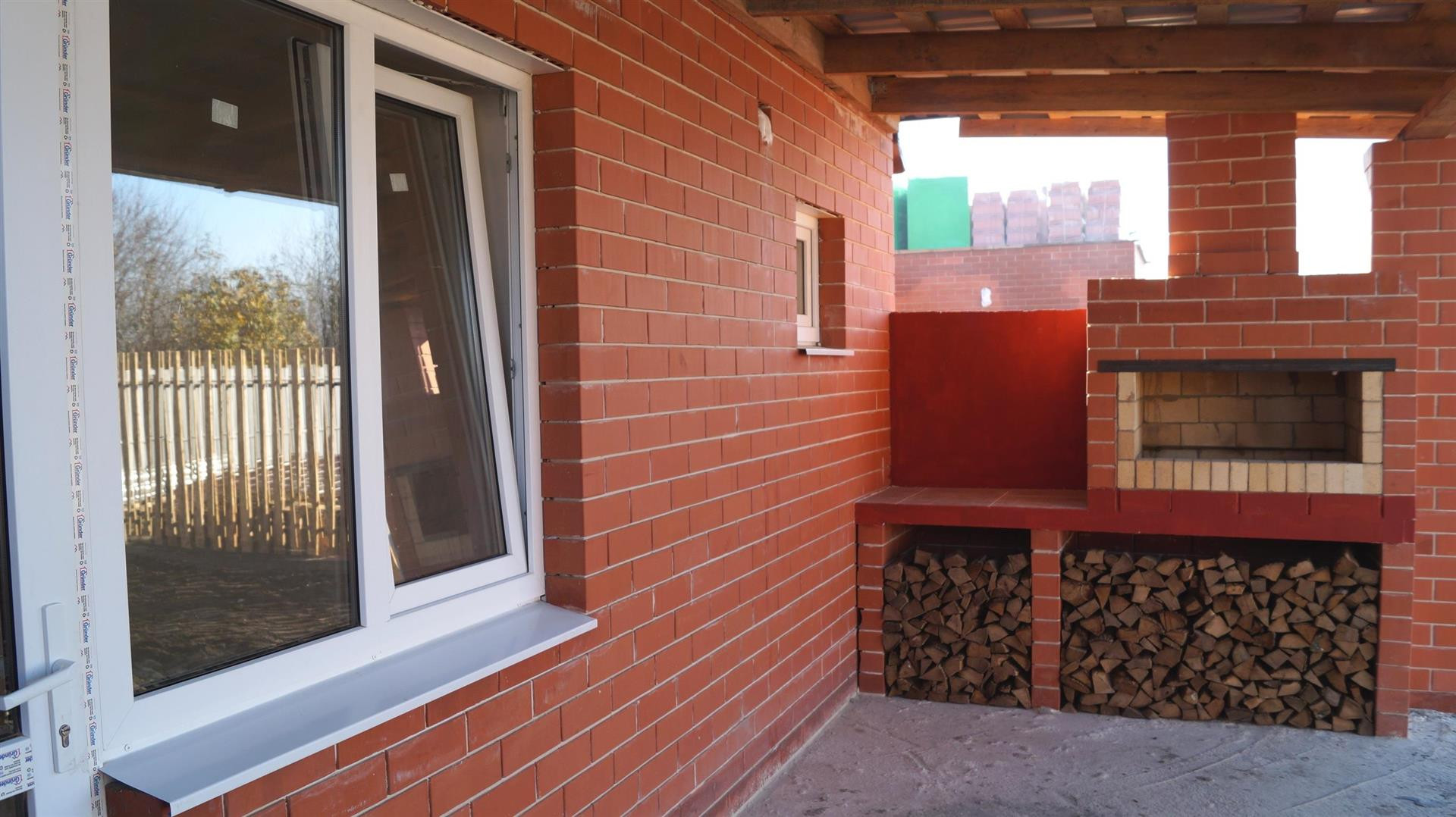 На первом этаже 2 спальни, просторный коридор, кухня с выходом на террасу с мангальной зоной из кирпича.