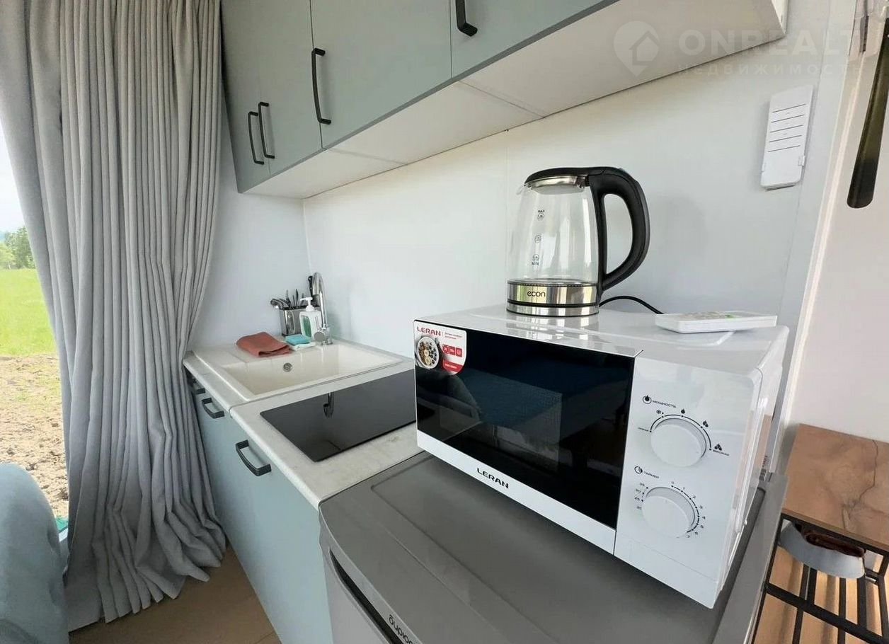 На кухне: микроволновая печь, индукционная варочная панель, холодильник, посуда, кастрюли, чайник, сахар, соль, чай, масло.