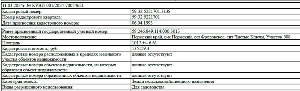 категория земли: Земли сельскохозяйственного назначения разрешенное использование: для садоводства Кадастровый номер 59:32:5221701:3138