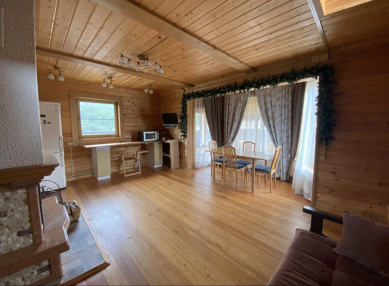 На первом этаже -  спальня - 9 кв.м., кухня-гостинная - 25 кв.м. с шикарным дровяным камином, из гостиной выход на веранду - 12 кв.м., бойлерная, совместный санузел - 6 кв.м., прихожая. Вс