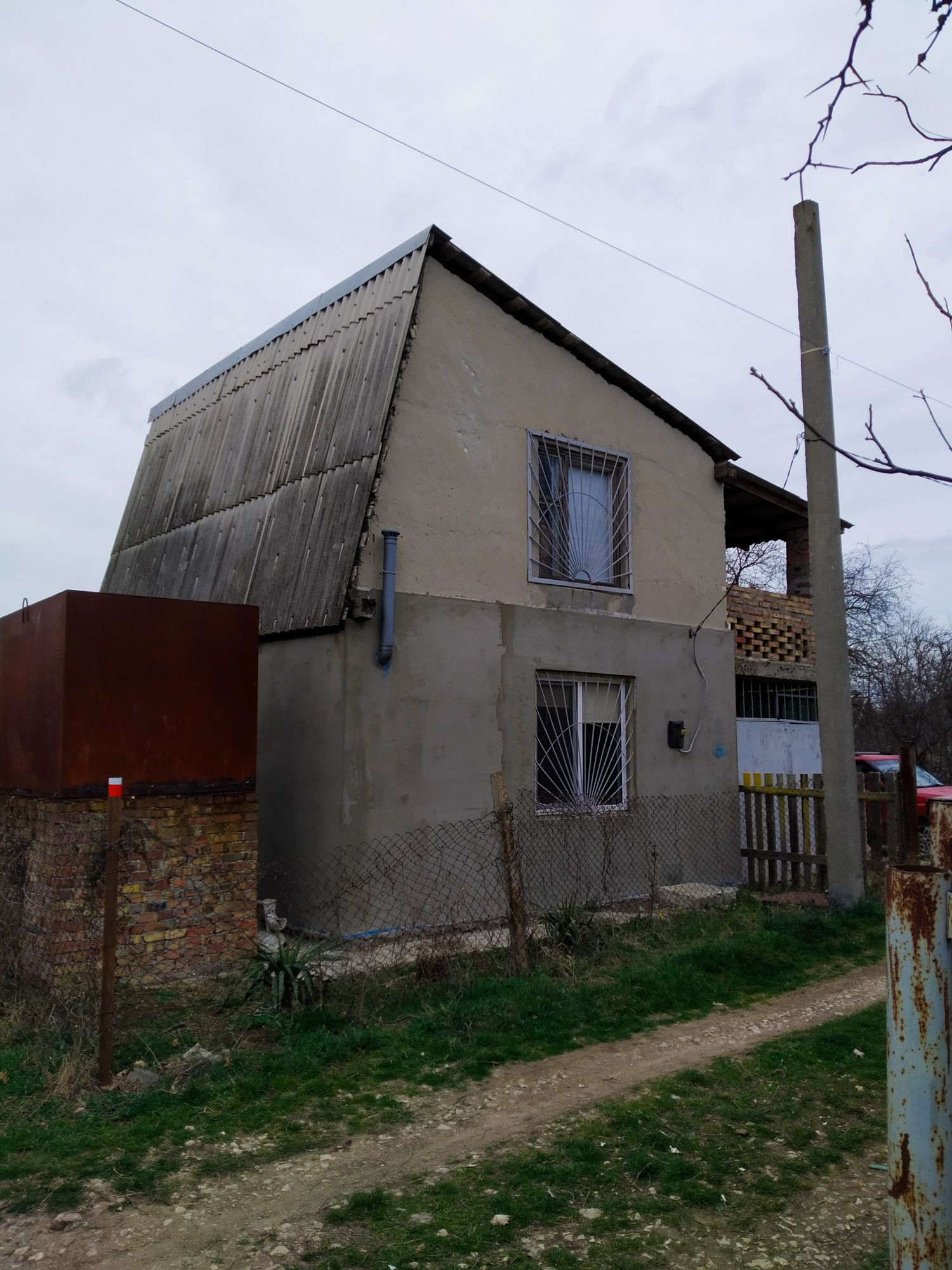 Дом двухэтажный, расположен на второй линии от центральной асфальтированной дороги, в середине улицы. Дом из инкерманского камня (1-й этаж утеплён), второй этаж  - без отделки. На первом этаже – кухня, прихожая, санузел (душевая, умывальник, унитаз, стиральная машина) и большая светлая комната, веранда. Установлены новые металлопластиковые стеклопакеты. Канализация – капитальный септик, есть емкость для воды на 1 куб. Участок ровный, без подтоплений, земля -чернозем. В доме свет, постоянная городская вода, газ - по улице (1 м от забора). Установлен бойлер на горячую воду, инверторный кондиционер, в доме есть вся техника для постоянного проживания. В доме можно жить круглый год. На участке имеются постройки (капитальный уличный туалет, сарайчик), площадка для машин. Интернет - есть возможность подключения. Прописка. Хорошие соседи - проживают постоянно. Рядом - пресноводное озеро с рыбой.
