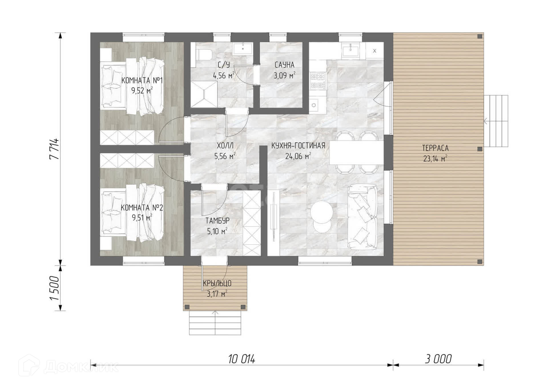 Дом двухкомнатный с большой кухней - гостиной 24,06 кв.м., двумя спальнями по 9, 5 кв.м., холлом 5,56 кв.м и совмещенным санузлом 4,56 кв.м., а так же просторной террасой 23,14 км.в. Подойдет для большой семьи, которые ценят простор и личное пространство!