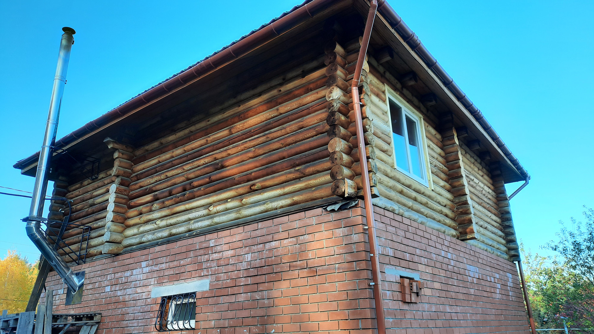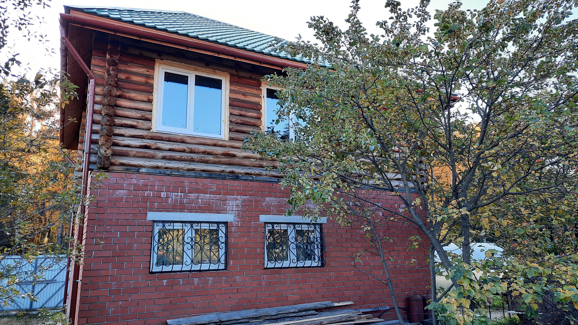 Дом - 1ый этаж кирпичный  на железобетонном фундаменте, толщиной 40 см, второй этаж из оцилиндрованного бруса Ф200.