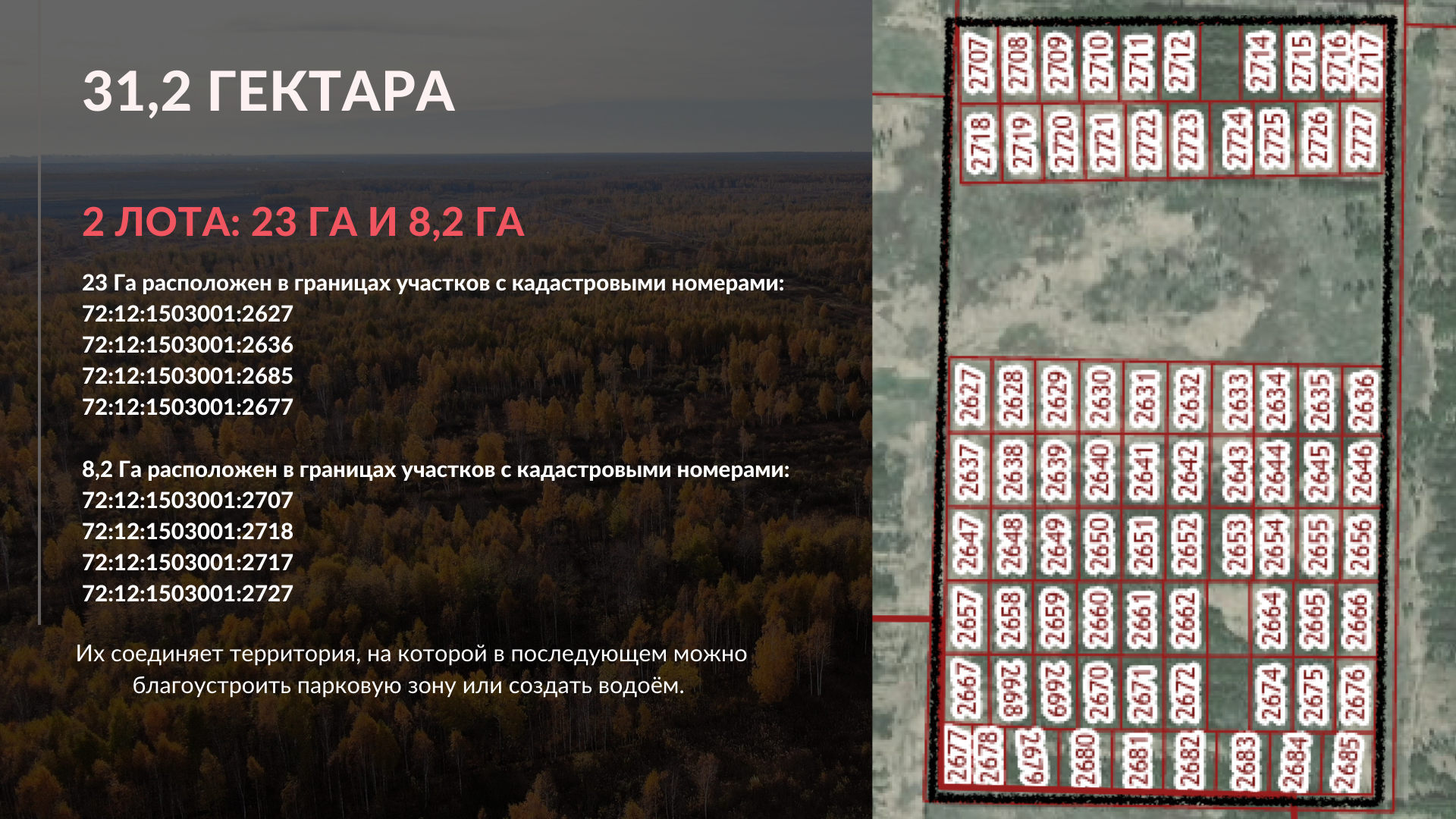 Участок в окружении леса под коттеджный поселок! ДНТ с правом строительства до 3х этажей. Дорога до участка (6км от Решетникова направо). Электрические сети - 800 метров, Газ - выданы тех.условия. Полностью окружен лесом, до ближайших дачных обществ ходит городской автобус. Варианты покупки: единовременная оплата, РАССРОЧКА, ипотека. 2 Лота: 8,2 и 23 Га, расположены рядом, между ними небольшой участок, который можно использовать, как водоем или парковую зону и таким образом эти участки можно объединить в один поселок- 31,2 Га в лесу с водоемом и парковой зоной. Может быть хороший проект. По инженерии и дорогам - поможем.