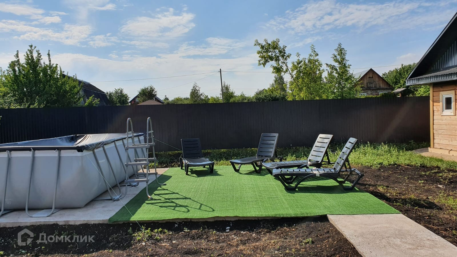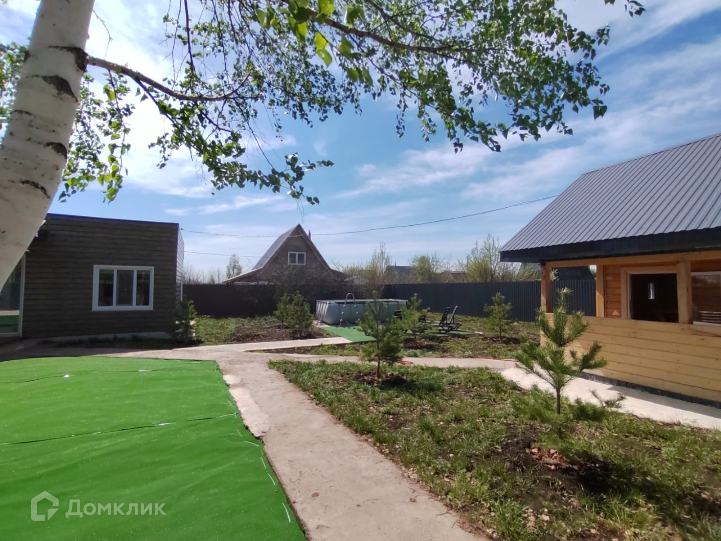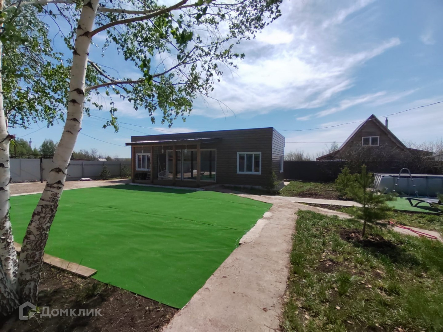 Территория огорожена забором и профнастила, залиты бетонные дорожки, место под парковку, место под бассейн, высажены деревья.