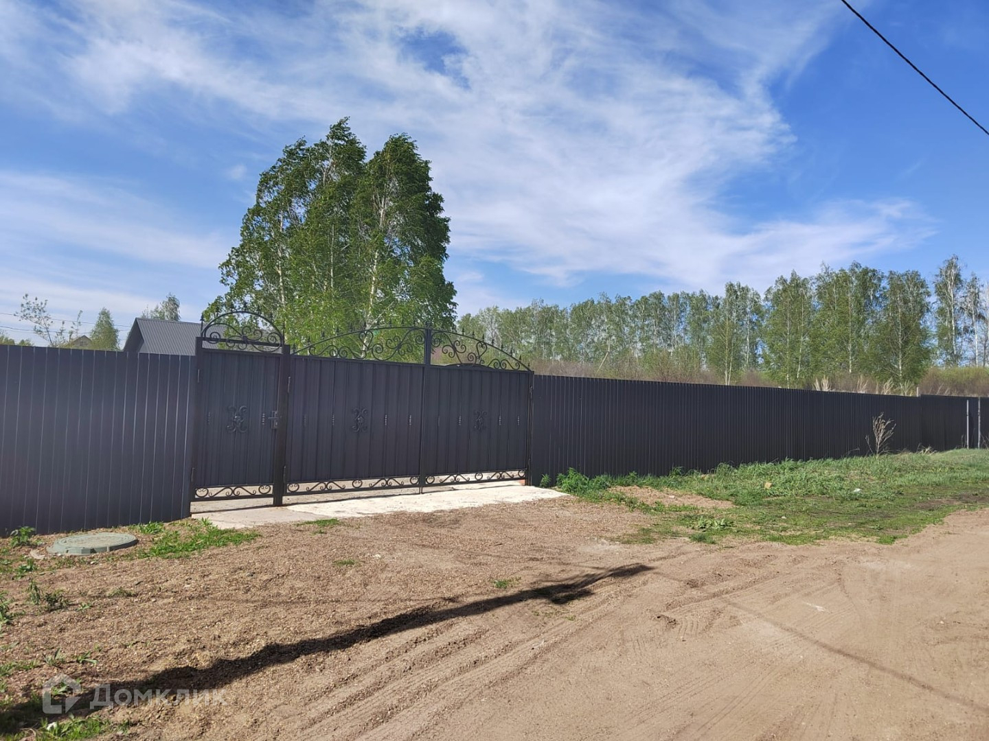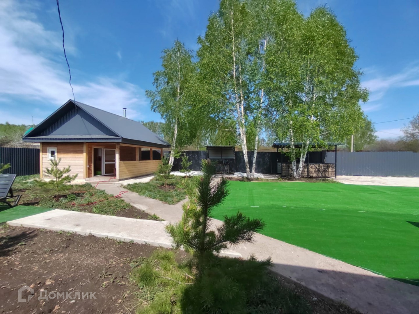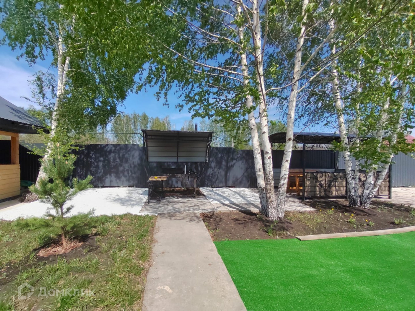 Территория огорожена забором и профнастила, залиты бетонные дорожки, место под парковку, место под бассейн, высажены деревья.