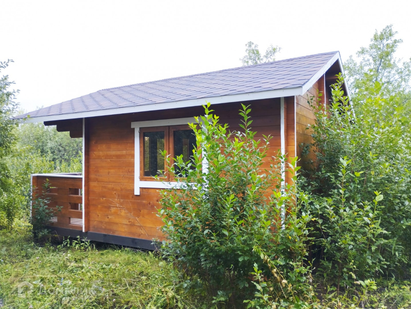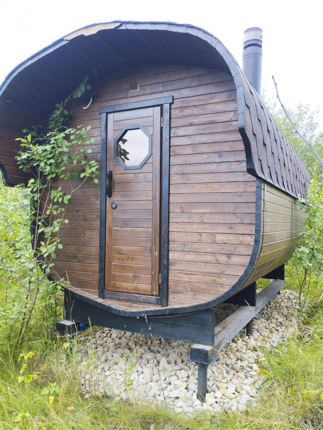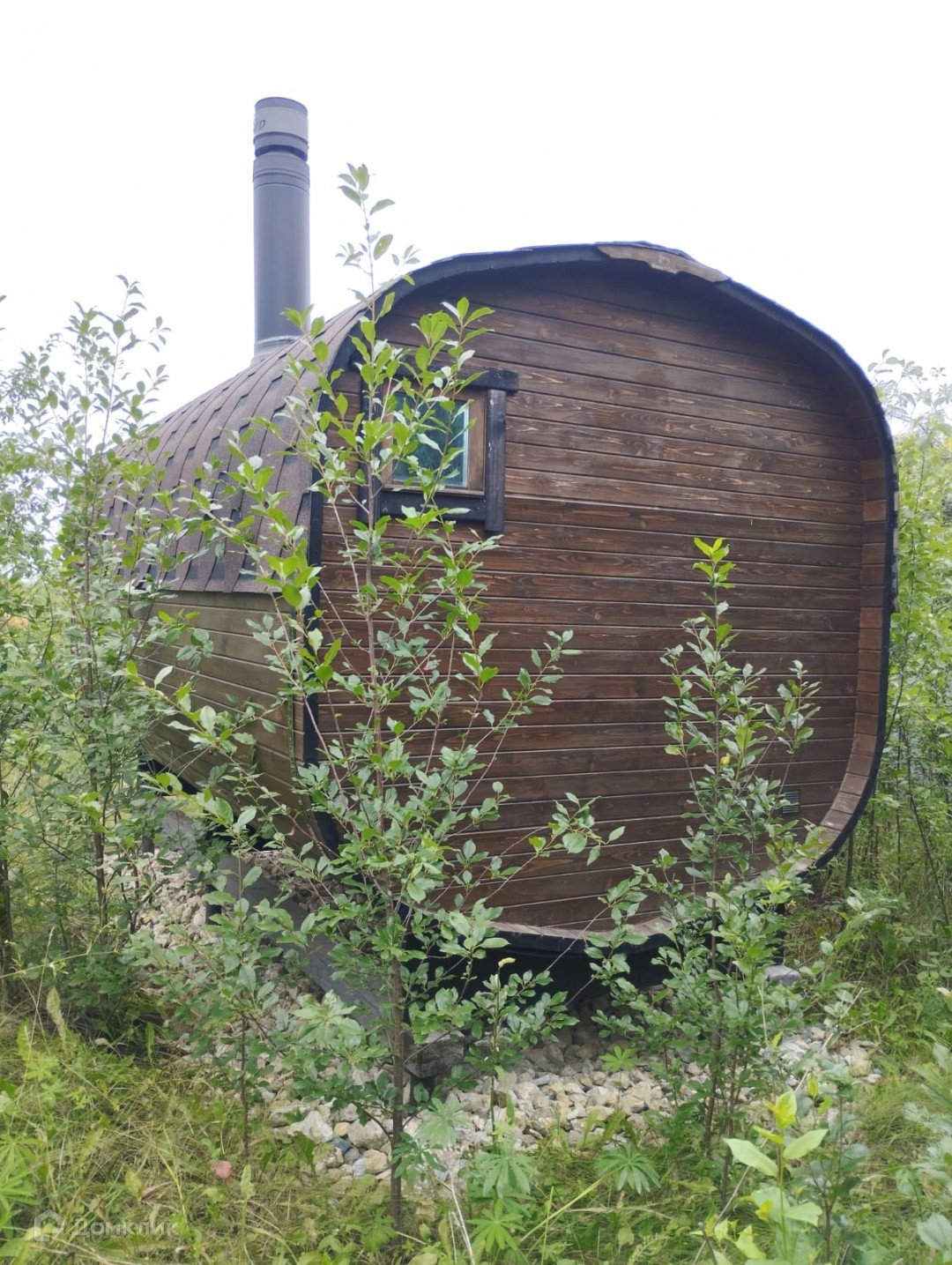 На участке есть навес на два автомобиля. Баня - бочка.