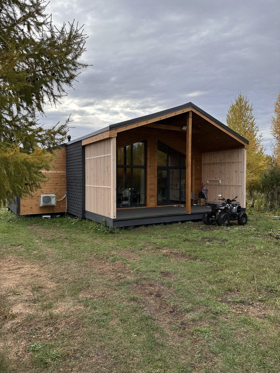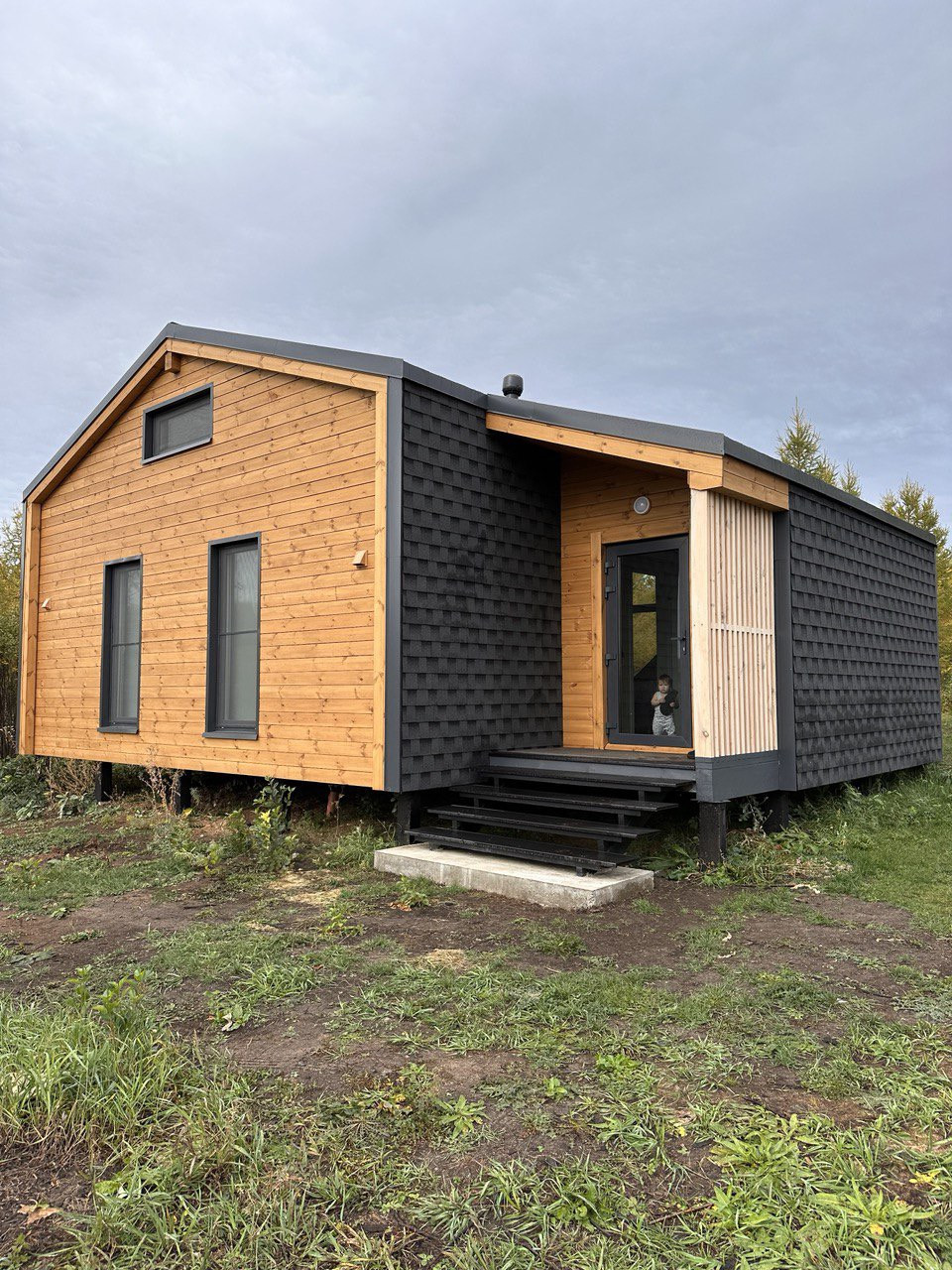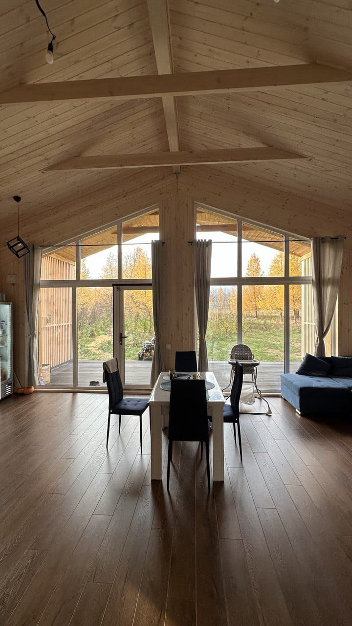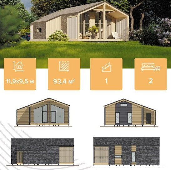 Дом в стиле барнхаус, общей площадью 93 м2, подойдет для постоянного проживания небольшой семьи из 3-4 человек. В доме отдельная прихожая с возможностью размещения большого шкафа, просторная кухня-гостиная с панорамным остеклением и выходом на террасу, с/у, две спальни с проемами для шкафов. Также есть возможность разместить антресоль над спальнями (в качестве дополнительной спальни либо игровой). Наружная отделка - шинглас и планкен. Окна пластиковые, 70й профиль, с ламинацией. Чистовая отделка - вагонка, кварцвинил.