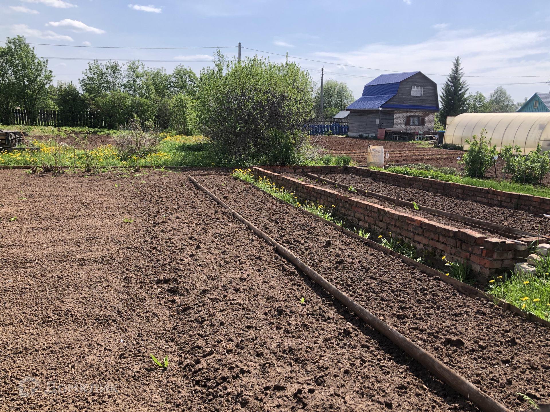 Земельный участок 5 соток. Земля очень плодородная, растут плодово-ягодные насаждения. Есть электричество, в любое время вода из скважины. На участке расположен крепкий дом из бруса 6,2х6,1 метров со вторым этажом. Окна забраны фанерой на зиму.  В доме располагается большой камин.  Фундамент ленточный. К дому пристроена баня. Состоит из 3 отделений( комната отдыха, помывочная и парилка). Туалет находится внутри дома. Рядом с домом закопана емкость- септик.