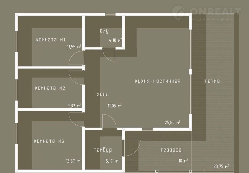 3 полноценные спальни, большая кухня-гостинная со вторым светом и панорамными окнами, сан-узел.