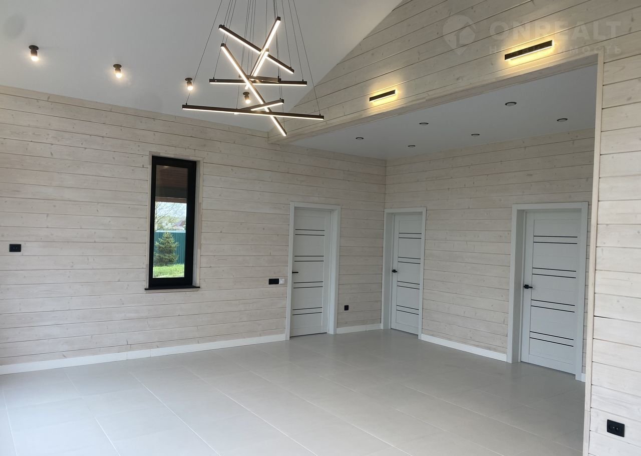 Стены отделка стен во всех помещениях выполнена в отшлифованной и покрытой лаком широкой имитации бруса (175 мм)