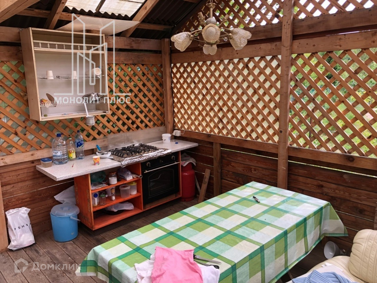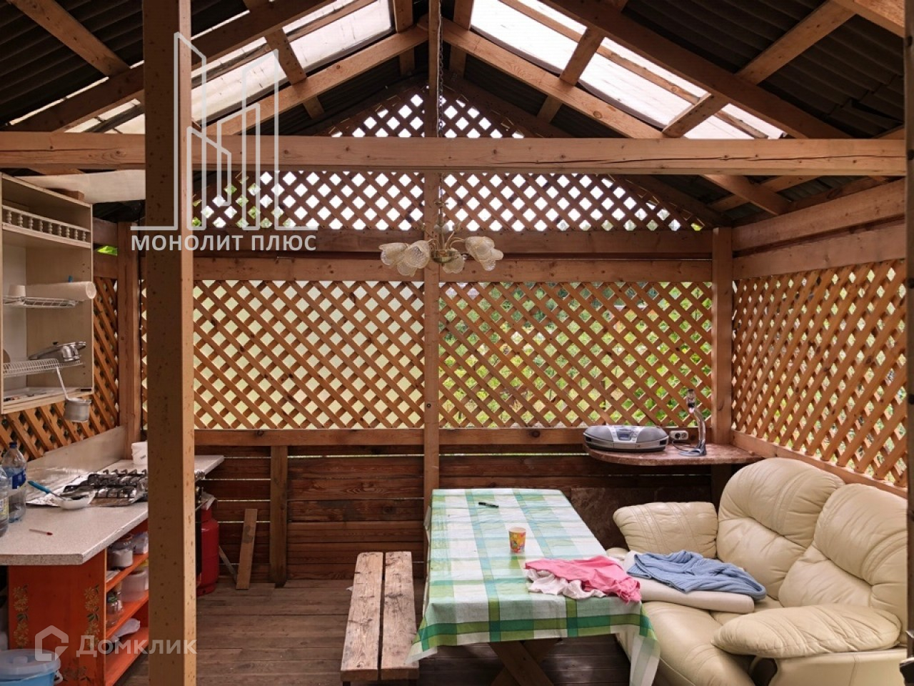 Дом каркасный, теплый с хорошей отделкой, высокие потолки. Еще на участке есть крытая беседка, хозяйственный блок с баней.