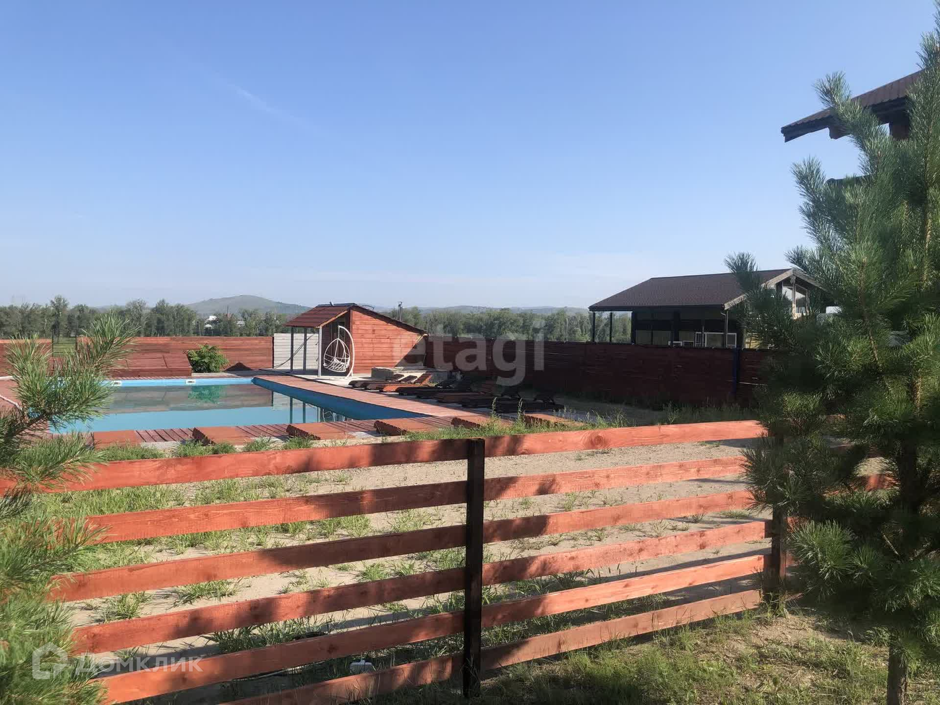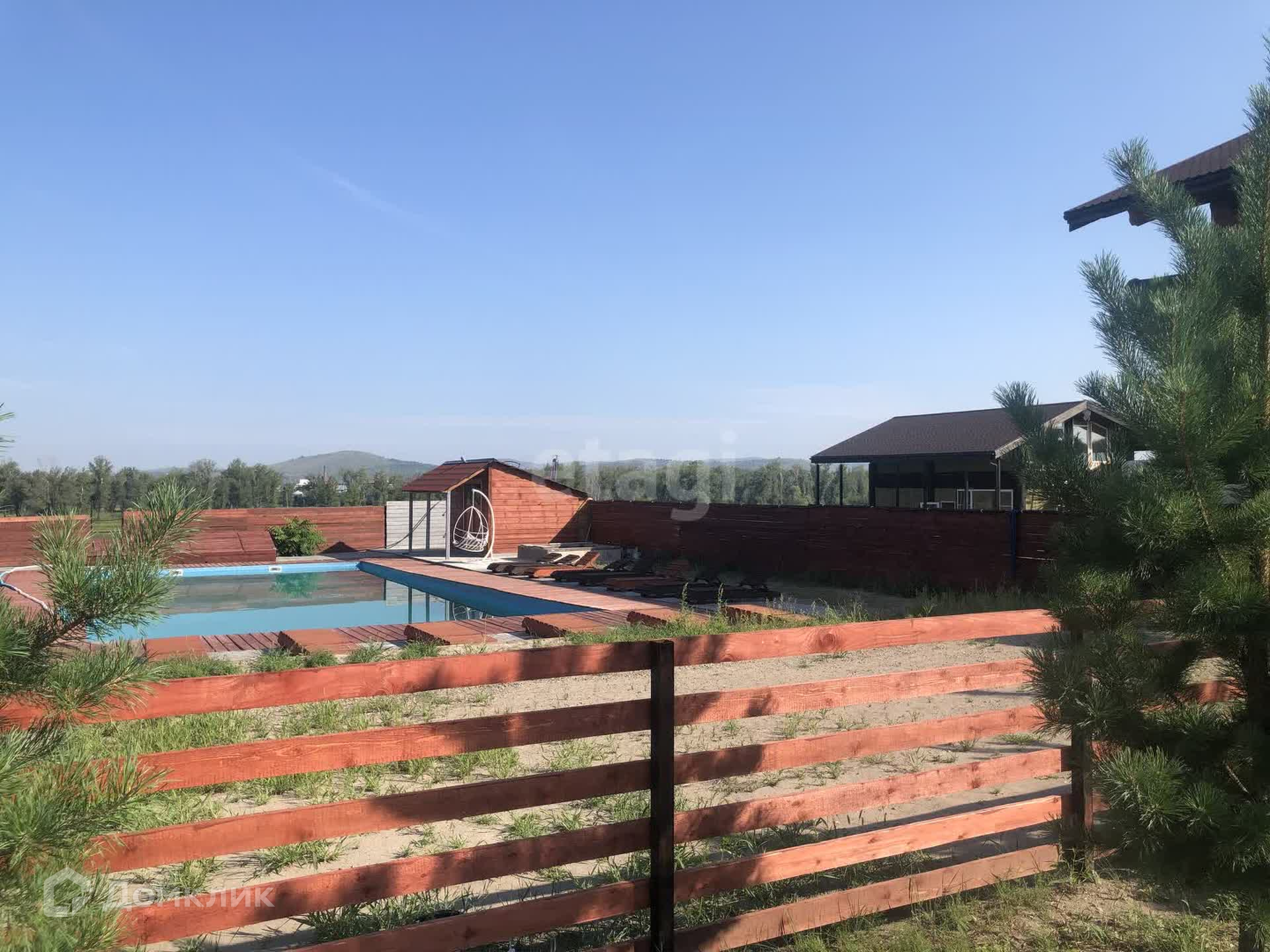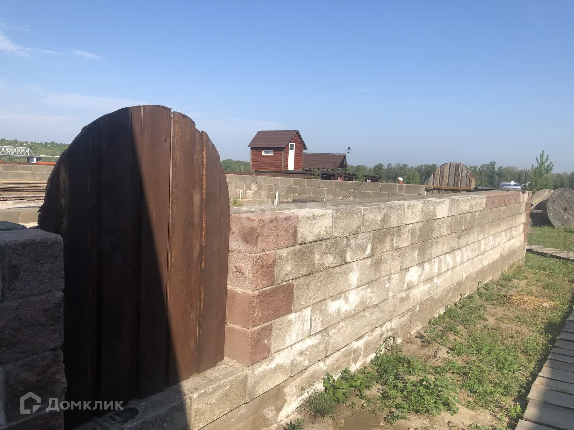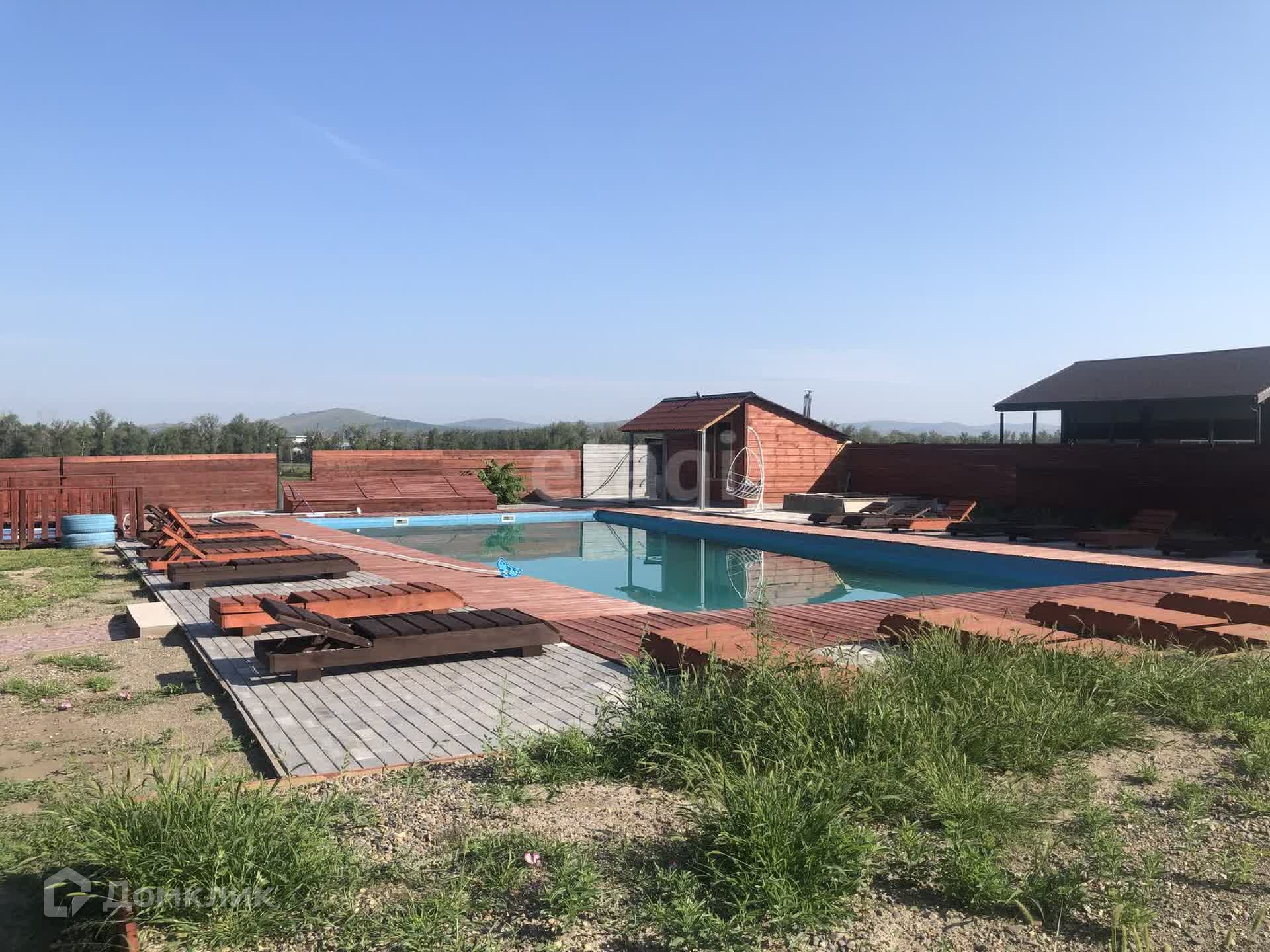 В продаже участок на берегу Енисея с банным комплексом и аквазоной. Первая береговая линия, прекрасный вид на реку Енисей. На территории данного участка есть два бассейна, баня, джакузи, оформлена территория бассейна шезлонгами и террасой. Есть недострой с фундаментом и несколькими рядами возведенного термоблока.
