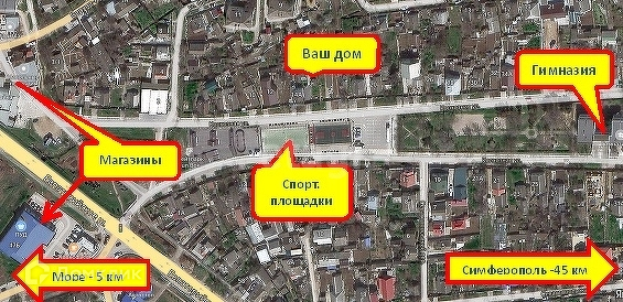 Домовладение располагается в очень комфортном для проживания и тихом районе города Саки. Рядом находятся гимназия, дет.сад, ЖД-вокзал, несколько остановок общественного транспорта, новая спортивная площадка и скейтодром. Дом находится на асфальтированной и чистой улице.