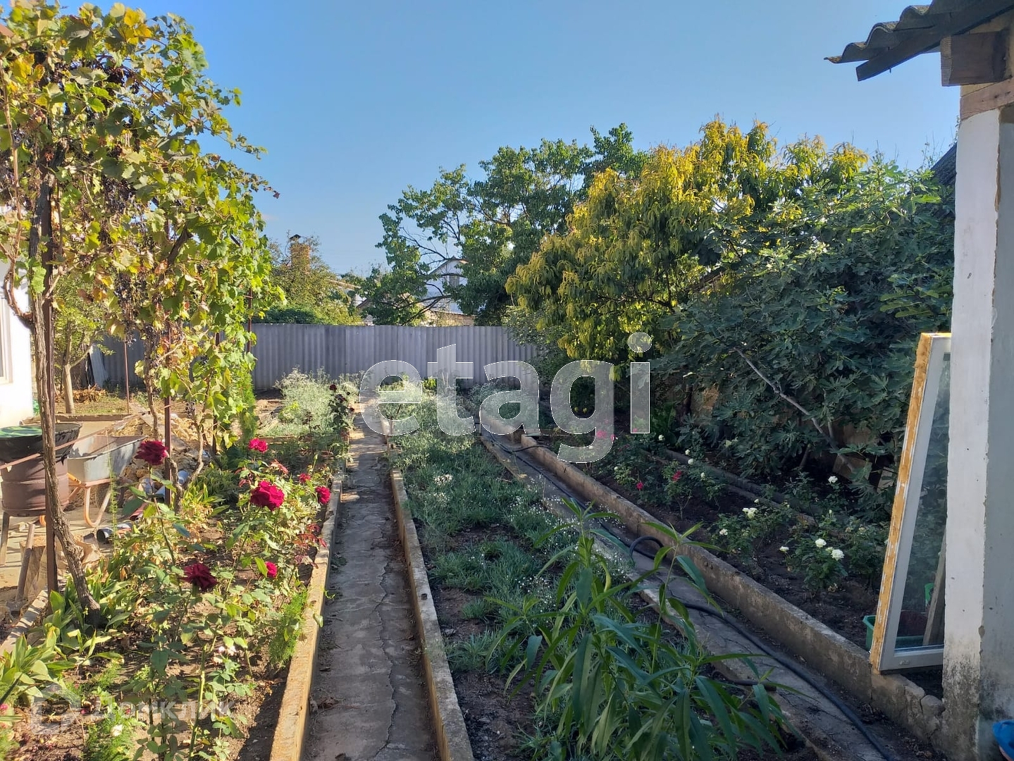 Участок прямоугольной формы, огорожен забором из ракушечника. На территории построены 5 номеров для сдачи отдыхающим, 2 душа, 2 туалета, летняя кухня.