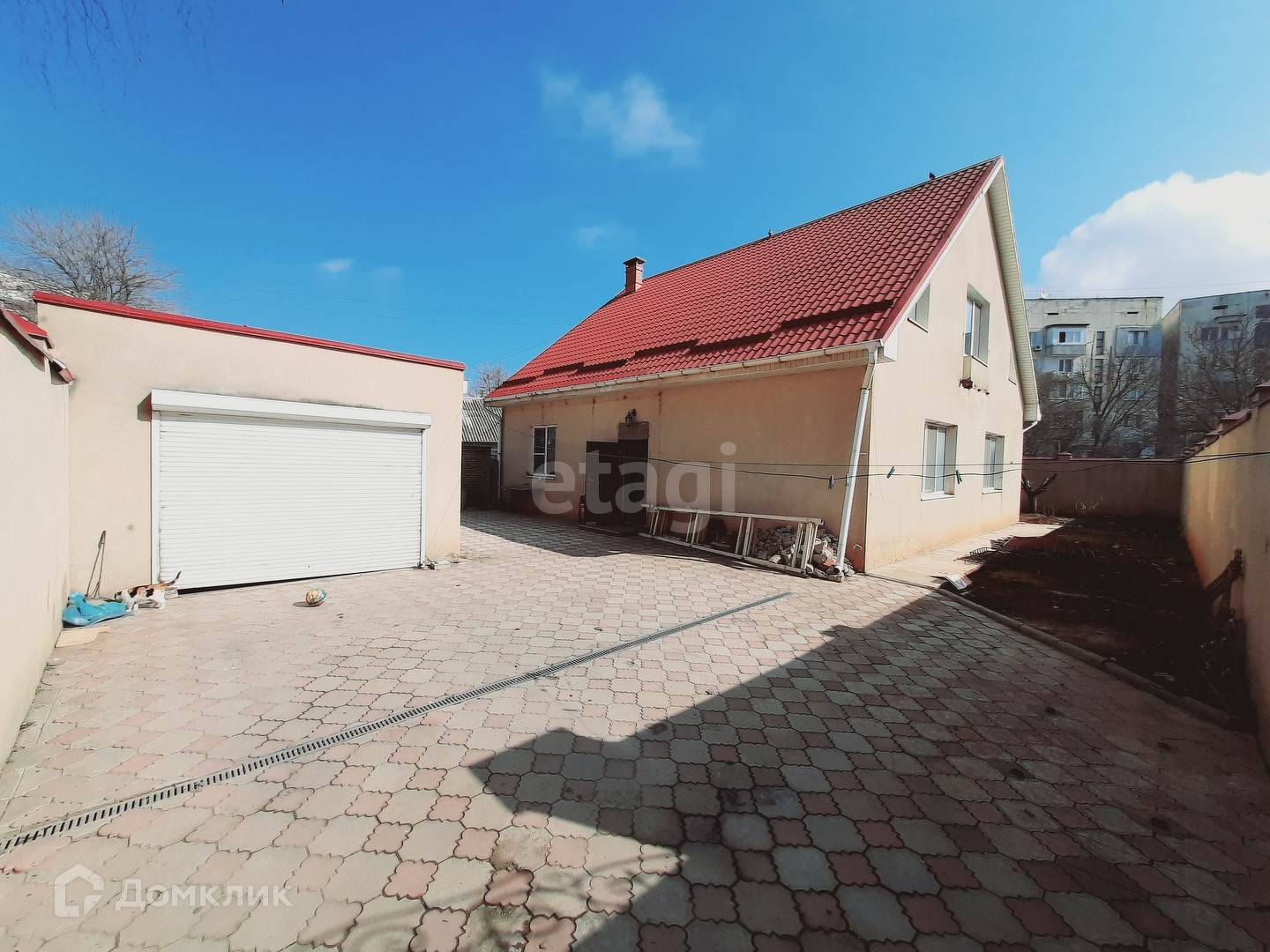 На земельном участке 5,5 соток также располагается гараж с роллетными воротами - 29 м2, мангал, произрастают плодовые деревья, двор в тротуарной плитке. Весь участок по периметру огорожен высоким каменным забором. Въезд через откатные ворота.