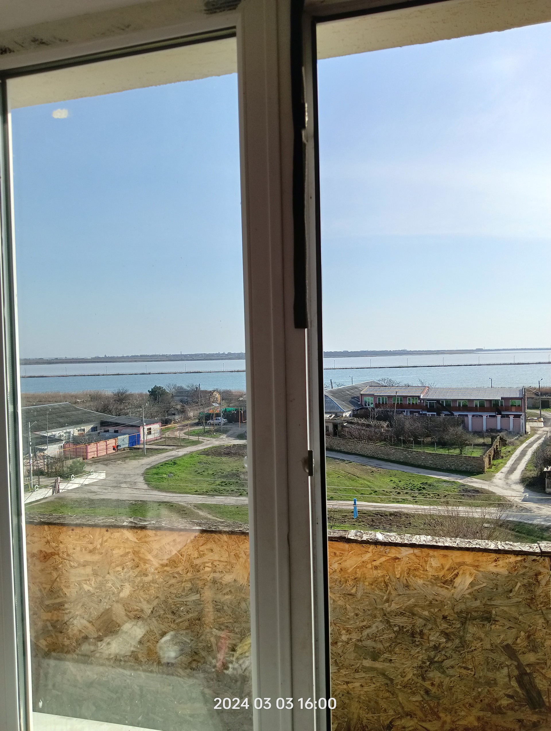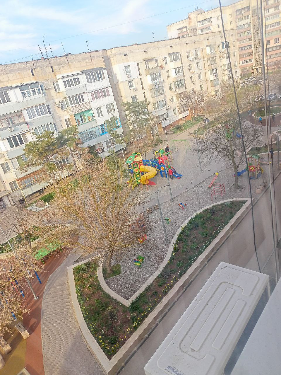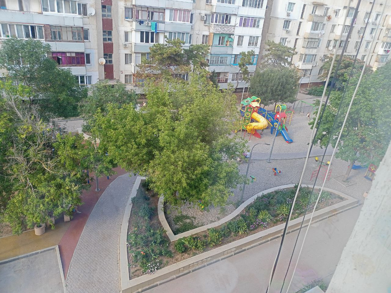 Окна одной комнаты выходят во двор с видом на детскую площадку, а окна второй (с балконом) на Сакские озера и море.