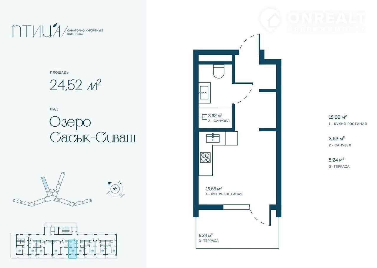 Квартира студия, 24.8 м2, этаж 4 / 16, на продажу в Саках