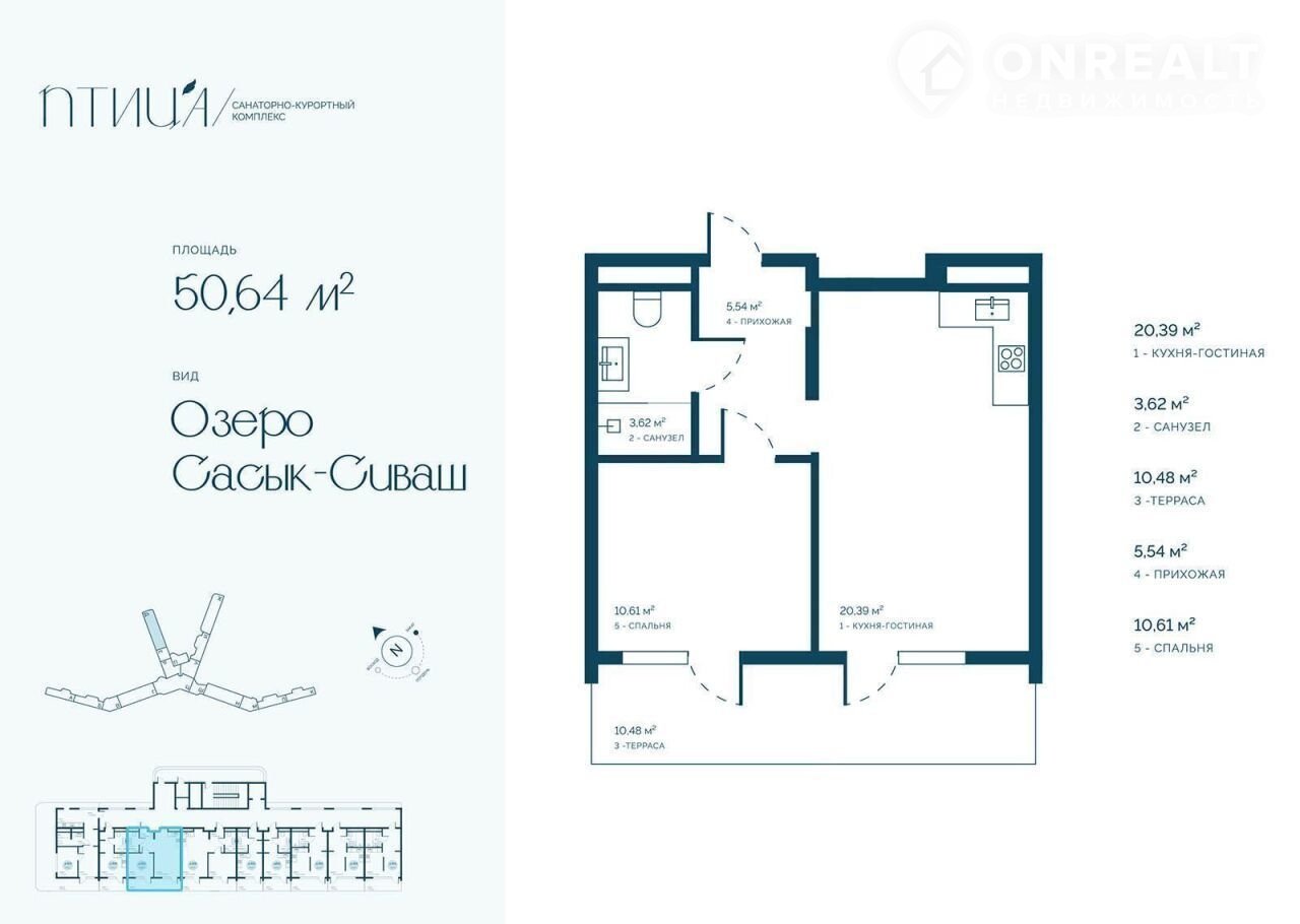 2-комнатная квартира, 51.2 м2, этаж 8 / 16, на продажу в Саках