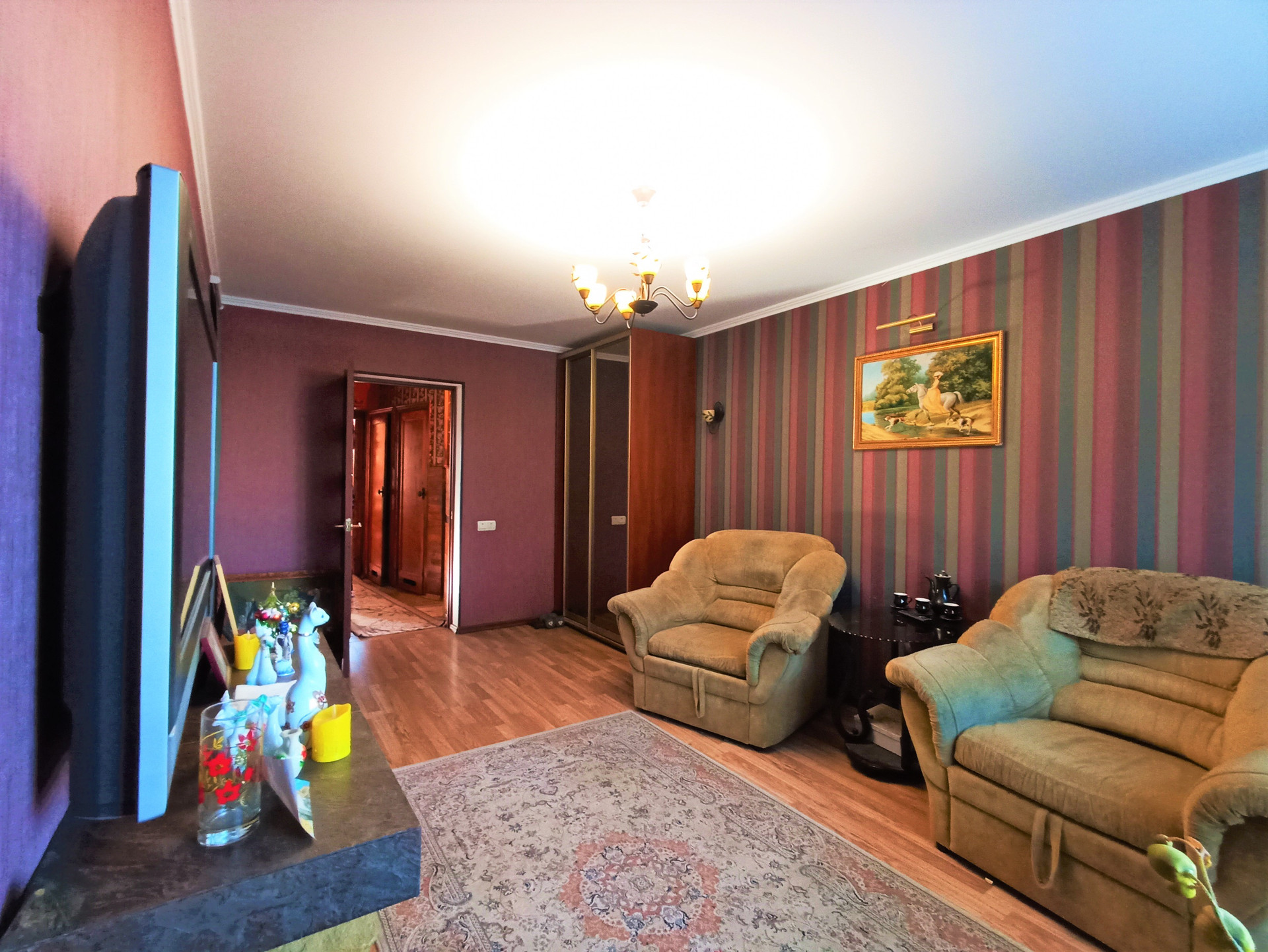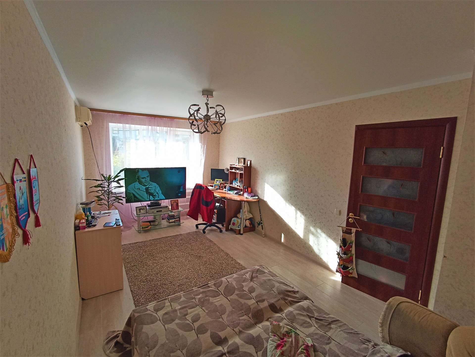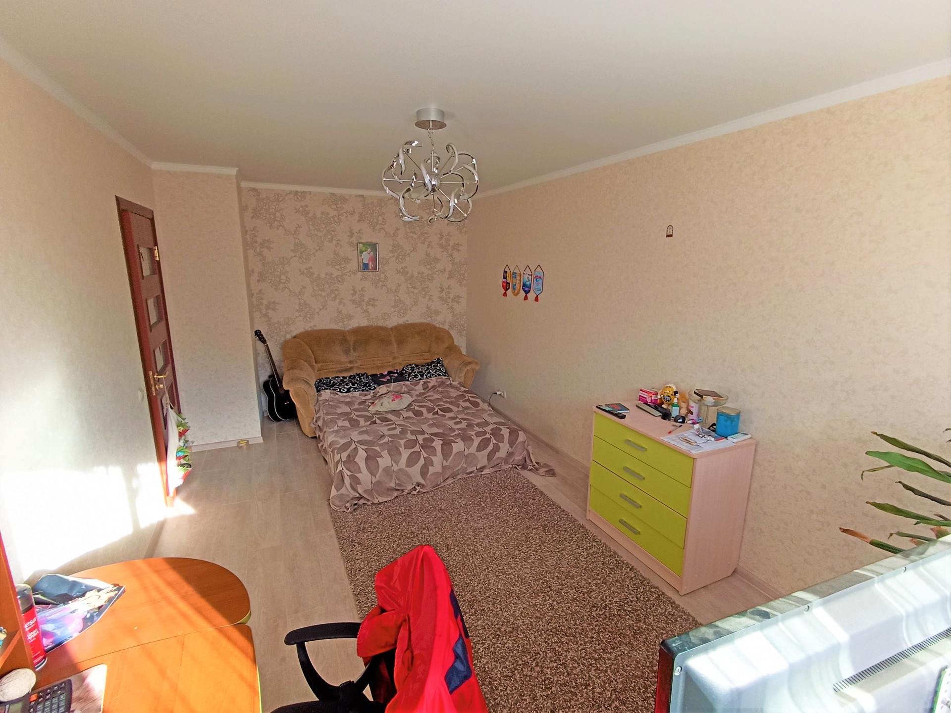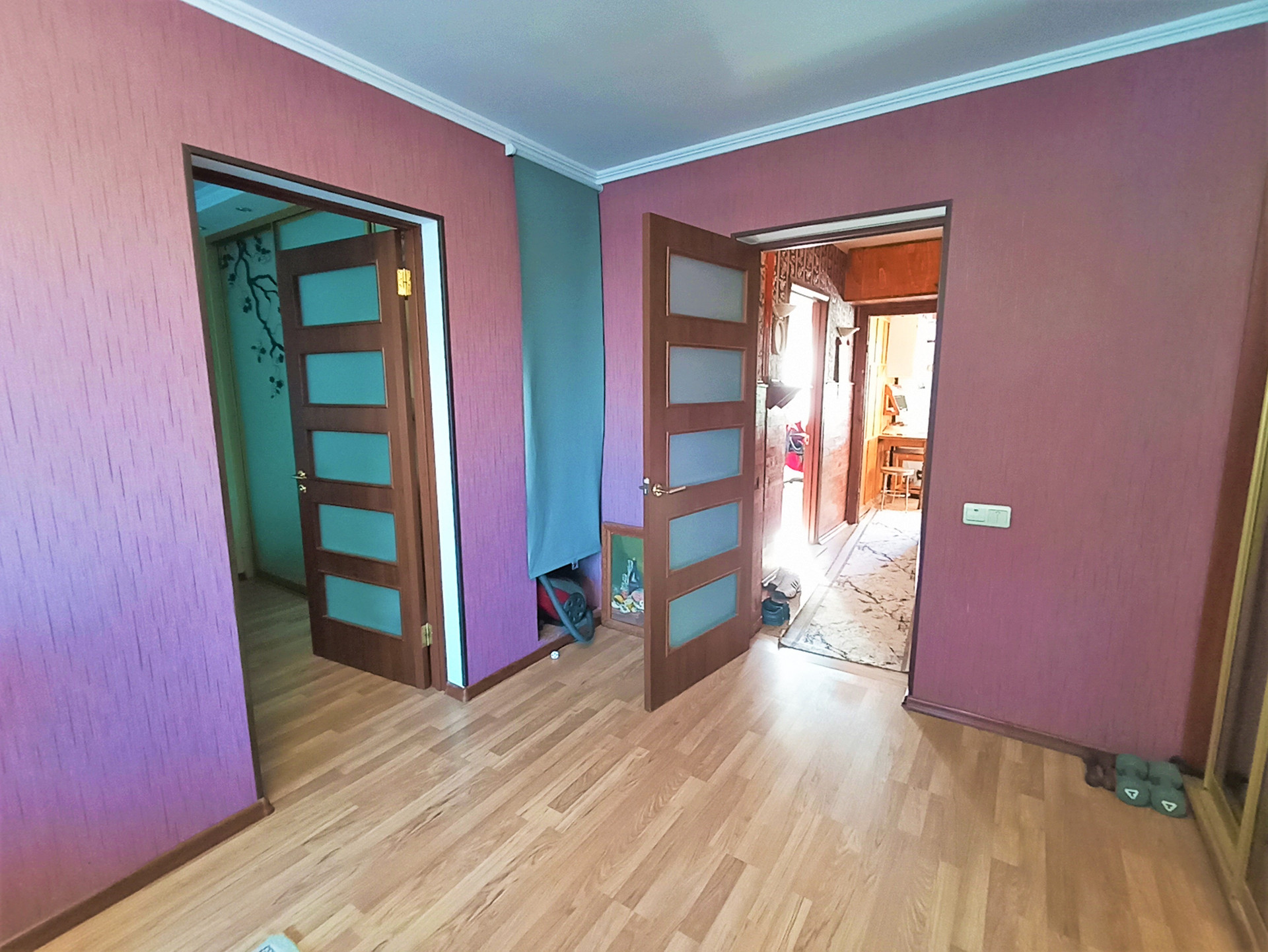 Установлены межкомнатные двери, панорамные металлопластиковые окна, система освещения- установлены люстры, матовые белые потолки, стены - обои.