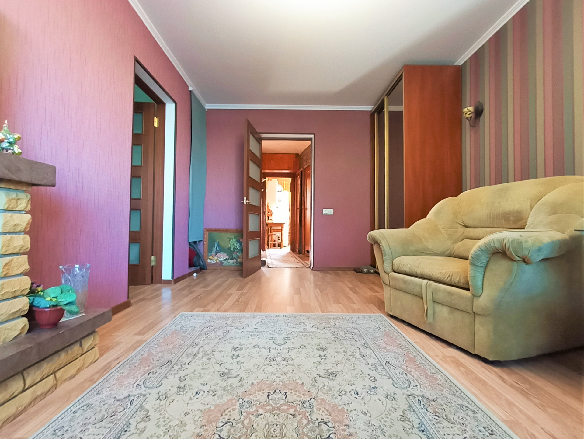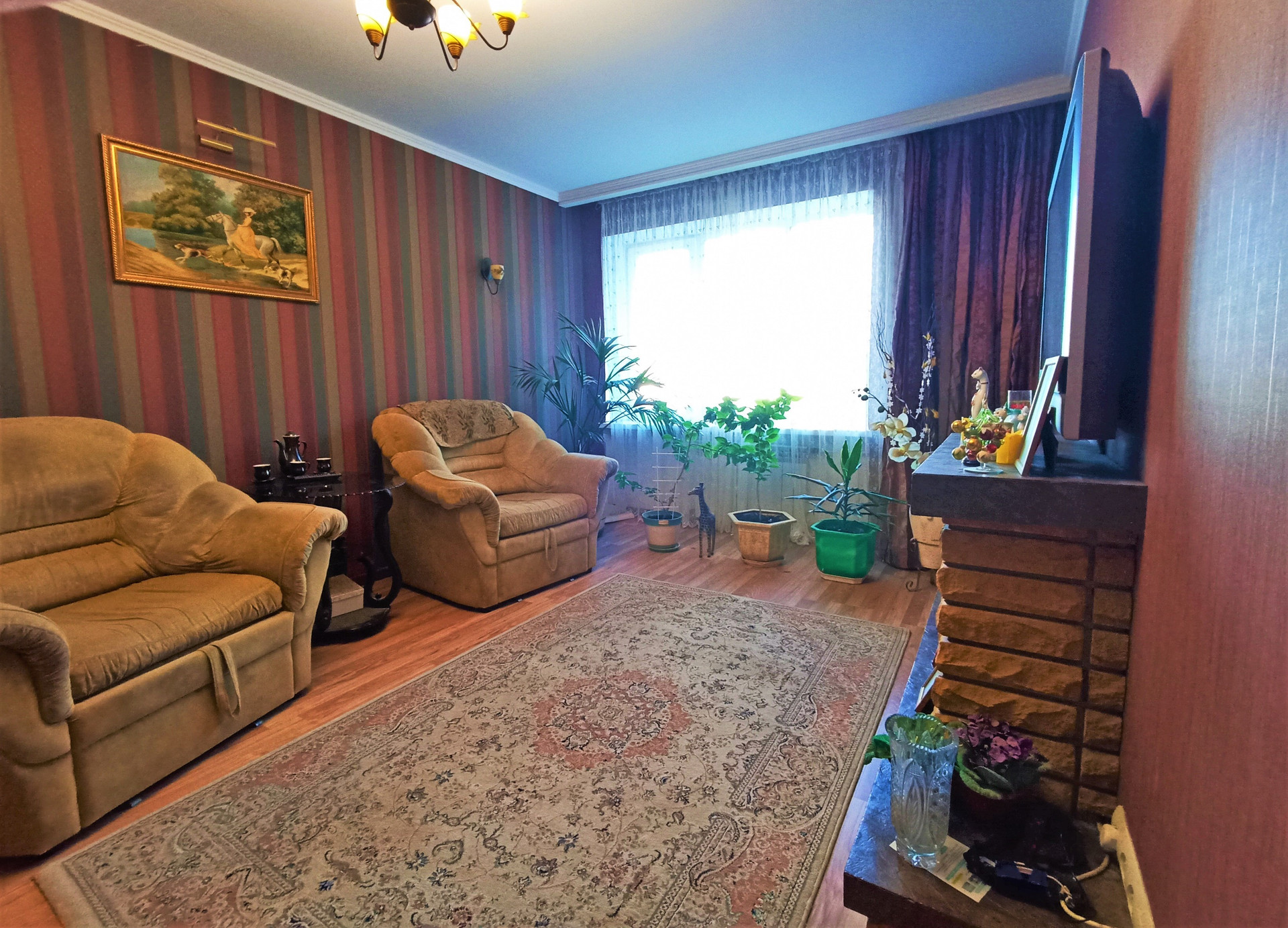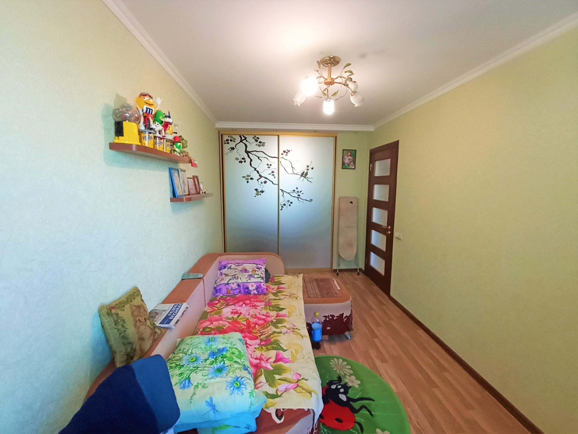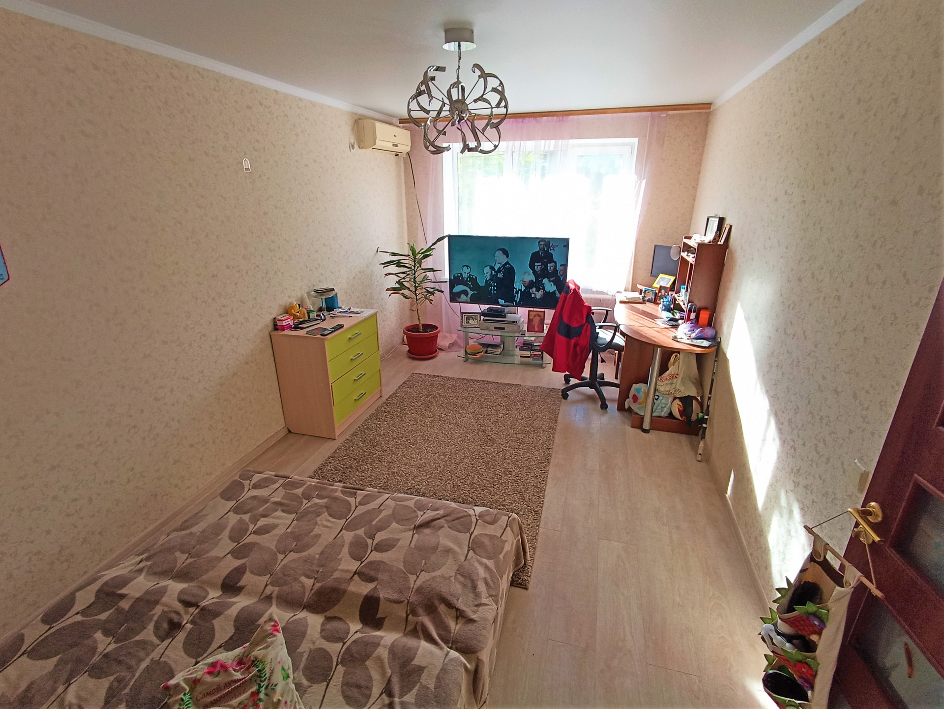 Установлены межкомнатные двери, панорамные металлопластиковые окна, система освещения- установлены люстры, матовые белые потолки, стены - обои.
