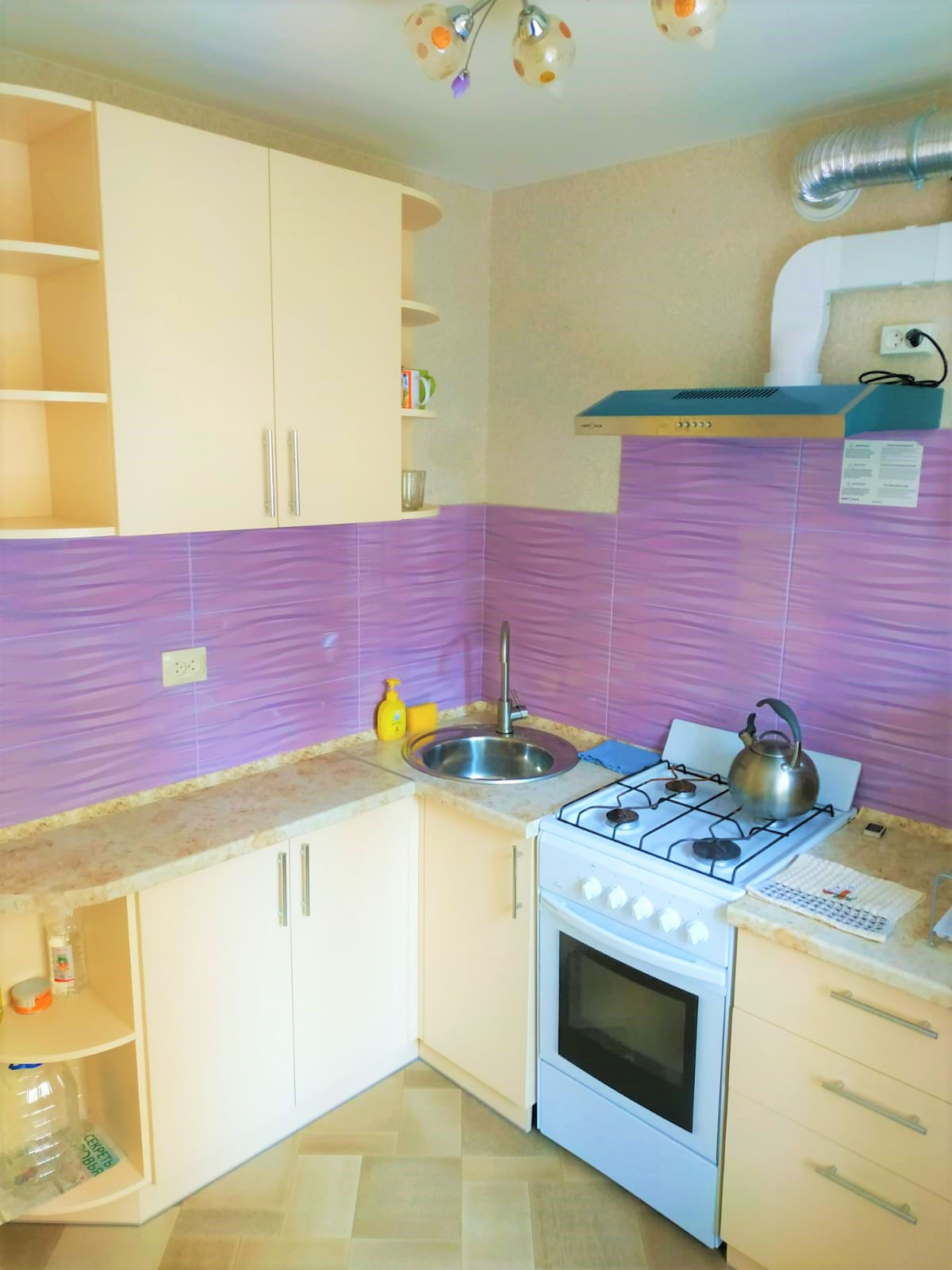 Кухня укомплектована встроенным гарнитуром с мебелью и техникой. В кухне установлена вентиляционная система.