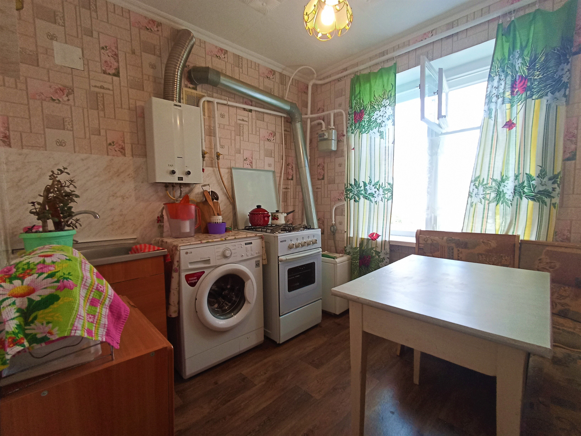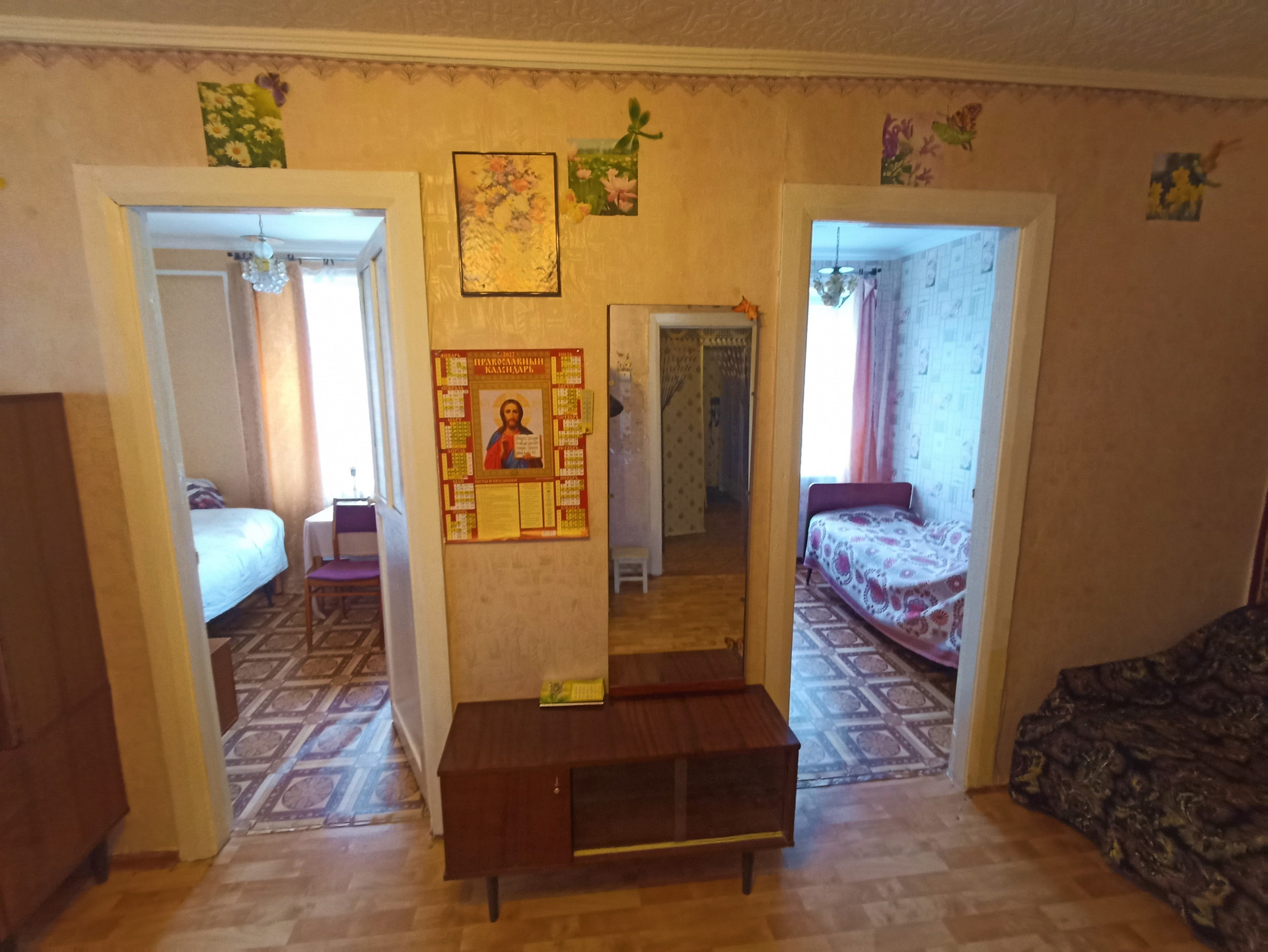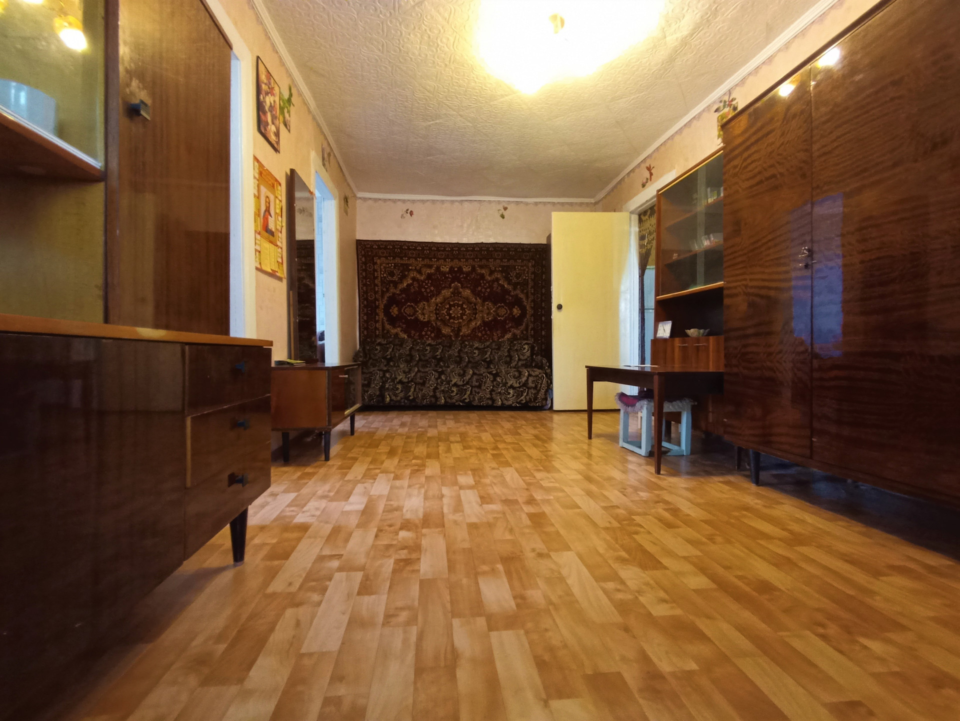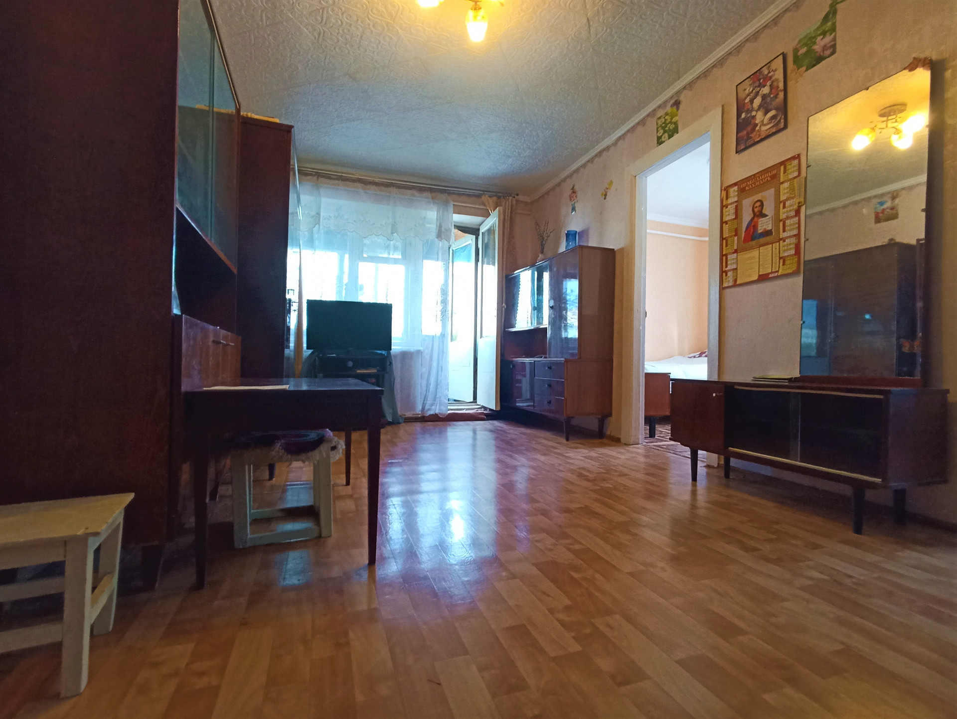 Отделка: Частичный косметический ремонт, потолочные панели, обои, линолеум, окна - частично металлопластиковые и стекло в деревянной раме, межкомнатные деревянные двери.