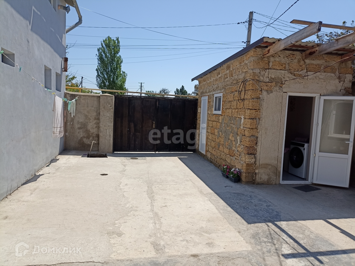 Отдельный асфальтированный двор 30 кв. м, огороженный забором из ракушечника и металлическими воротами.