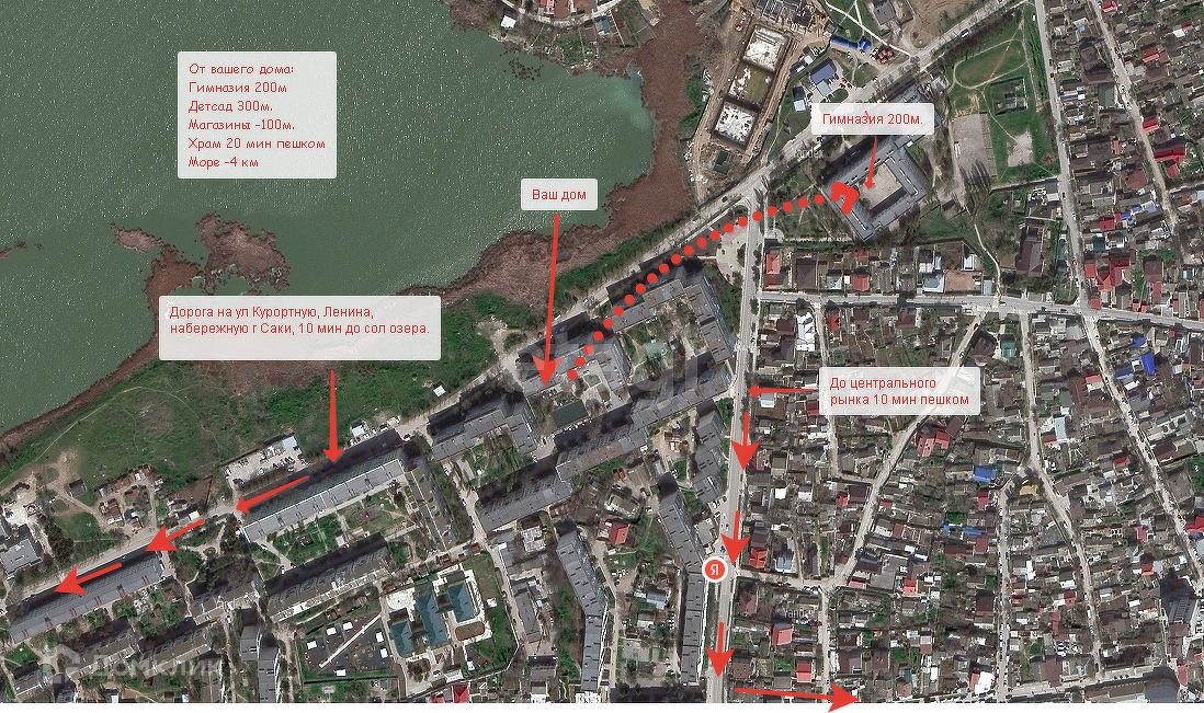 Дом расположен возле Евпаторийской трассы, но находится в спокойном и тихом месте, дружелюбные соседи. В пешей доступности находятся две школы и гимназия, а также садик, магазины и центр города в 5 минутах ходьбы. Удобная транспортная развязка.