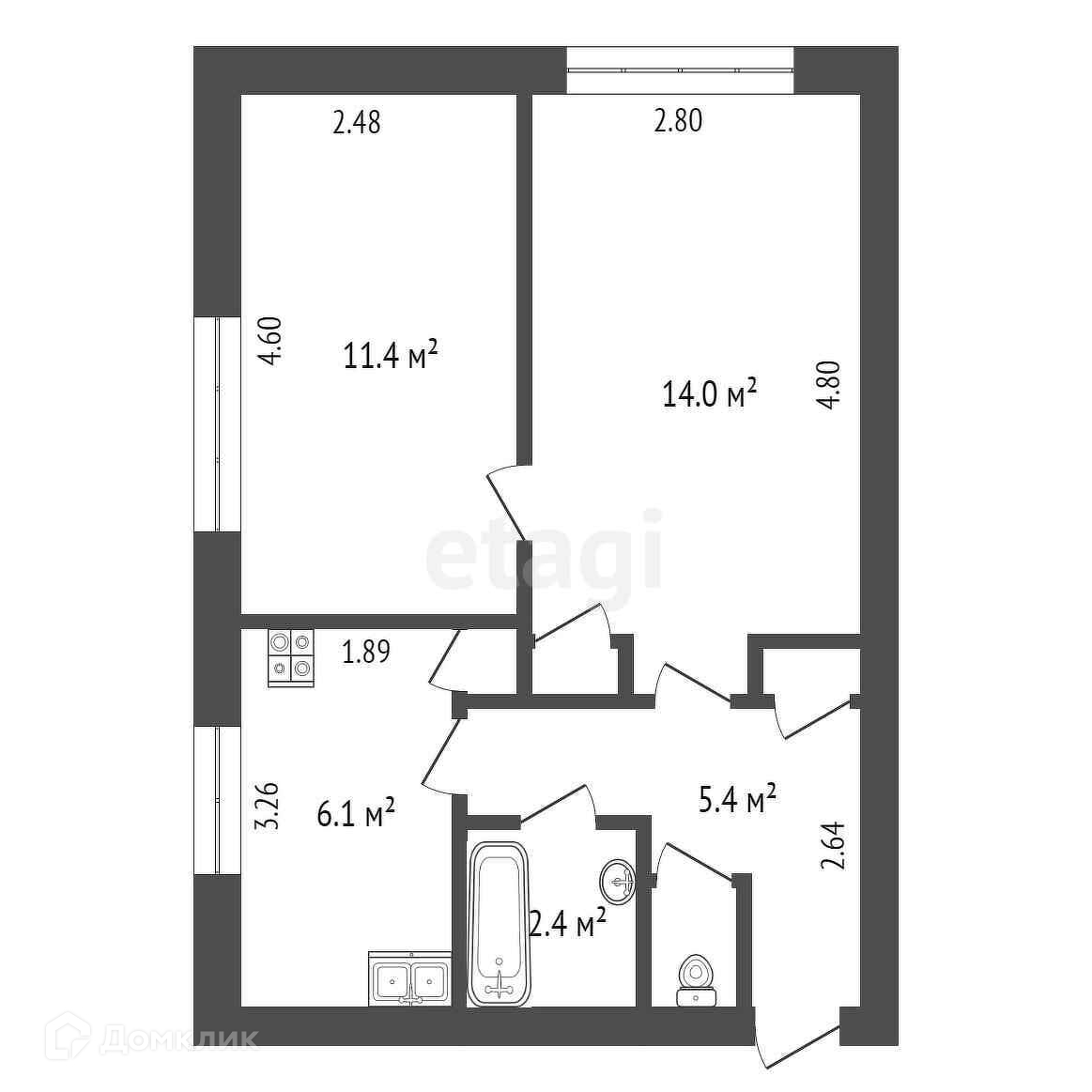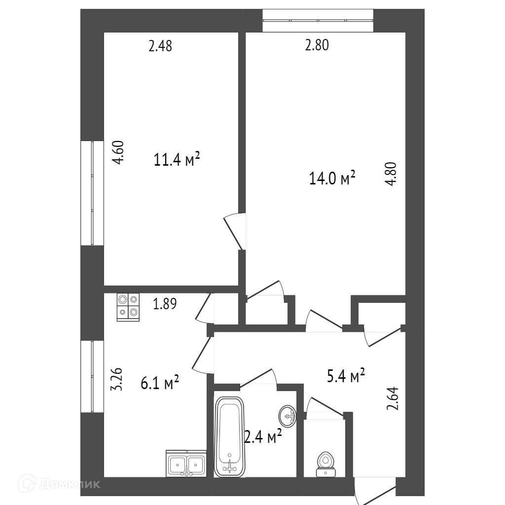 Квартира общей площадью 41 м2, состоит из двух жилых комнат - 14 м2 и 11,4 м2, кухни - 8,3 м2, совмещенного санузла и прихожей.