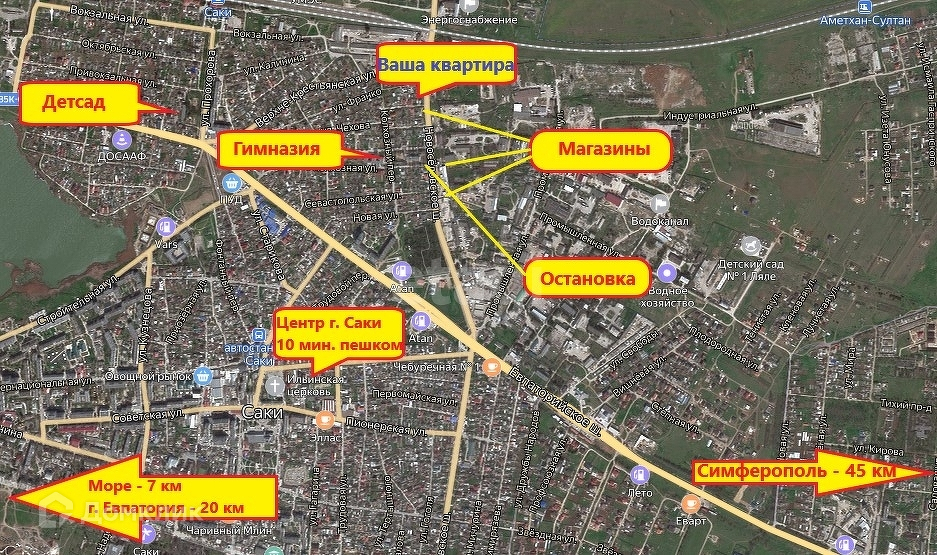 До центра города - 10 минут пешком, до моря - 7 км, до г. Евпатория - 20 км, до г. Симферополь - 45 км.