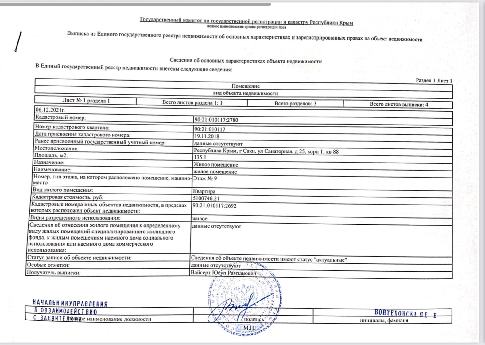 4-комнатная квартира, 135.1 м2, этаж 9 / 9, на продажу в Саках, Санаторная улица, 25к1