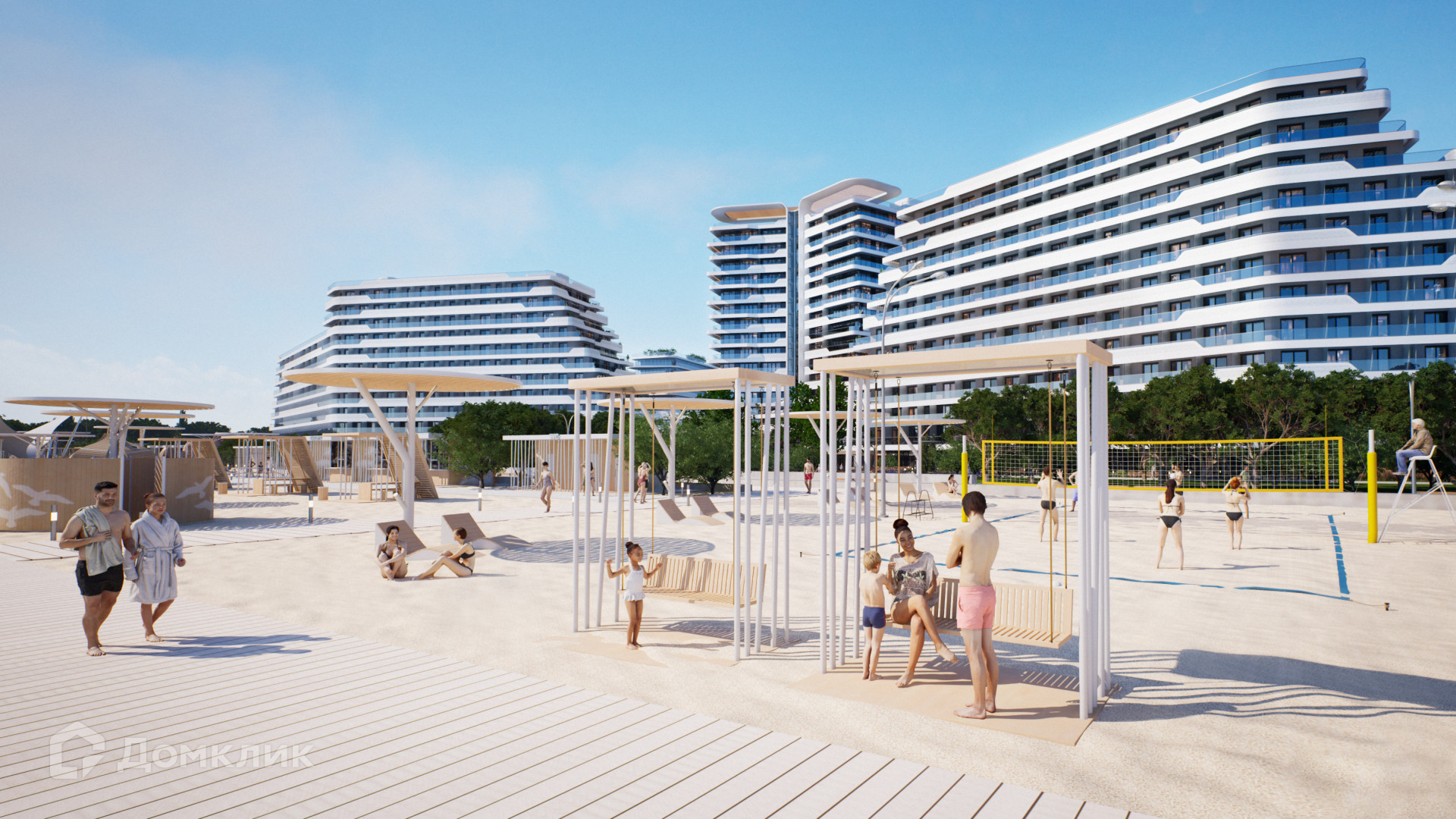 Территория комплекса охватывает 13 Га земли. Продуманные архитектурные и ландшафтные решения - здание, напоминающее силуэт птицы, санаторий в виде солнца и другие оборудованные пространства для активного и пассивного отдыха.