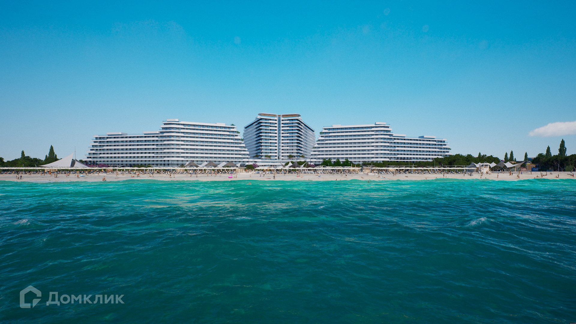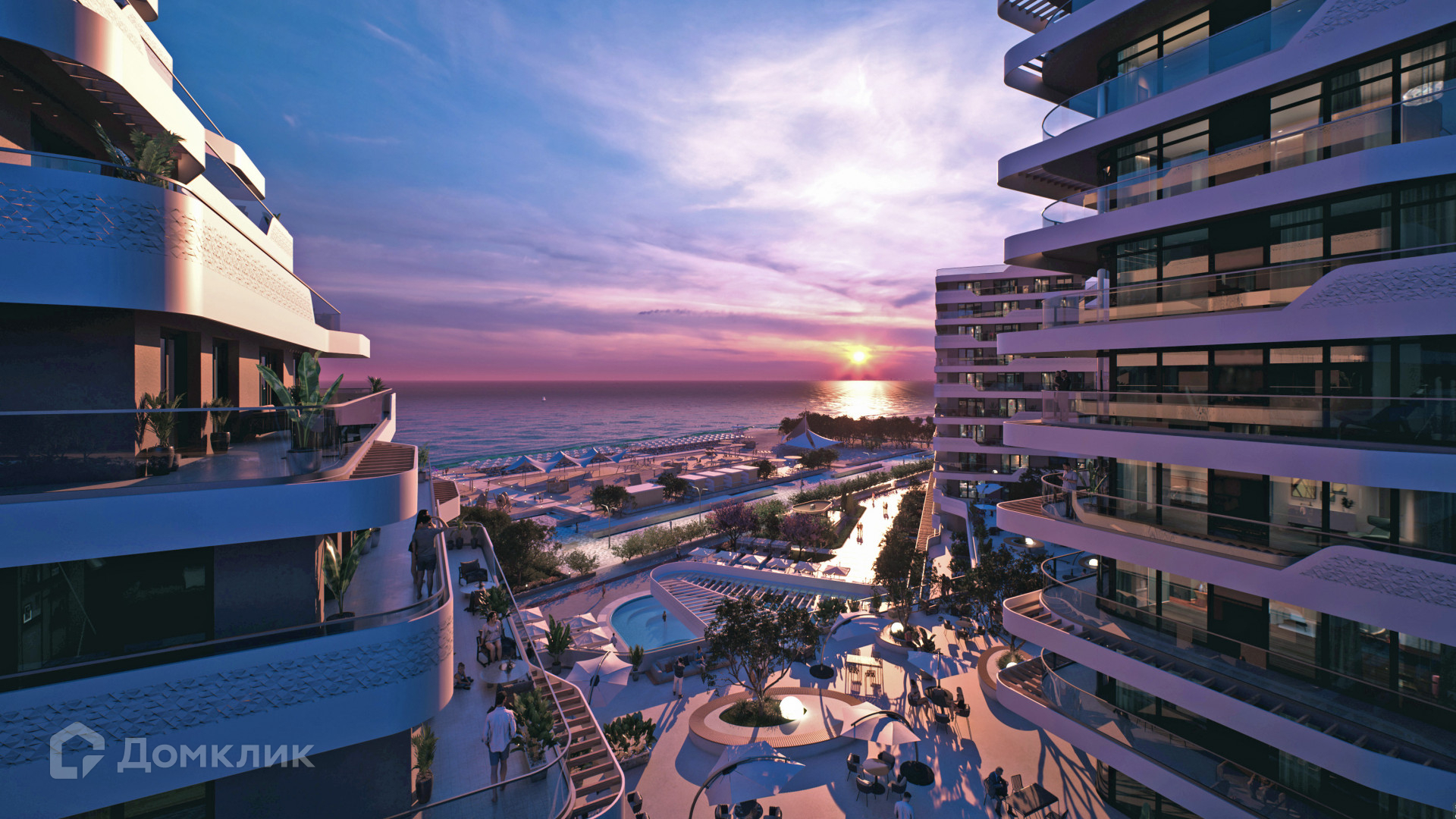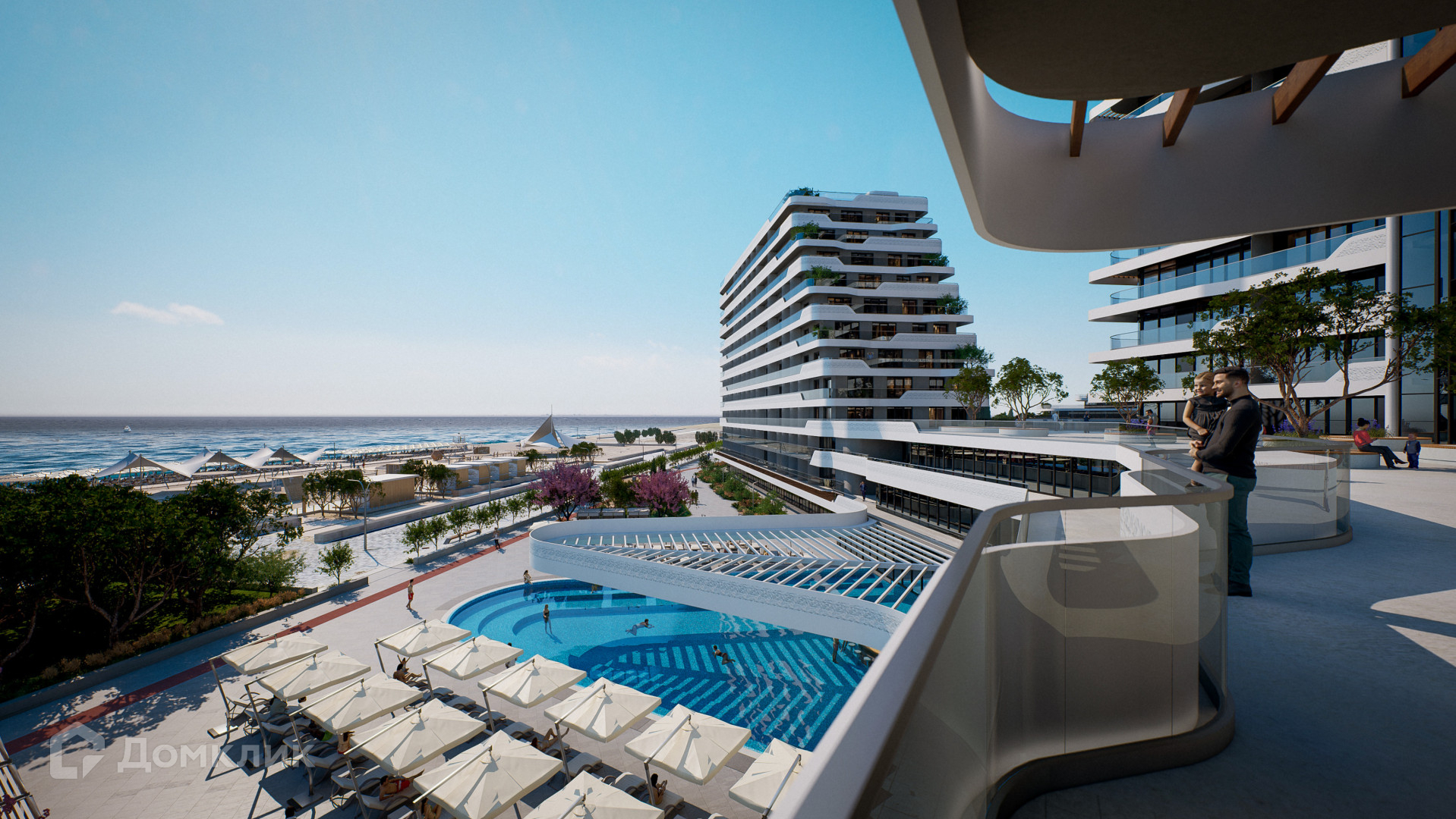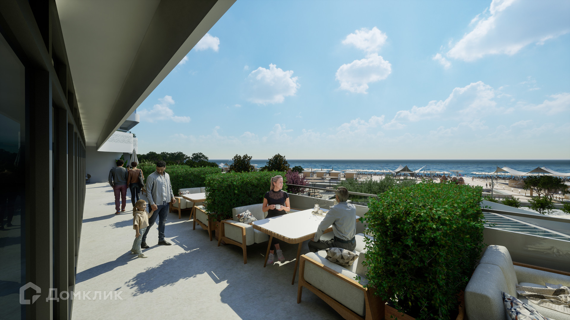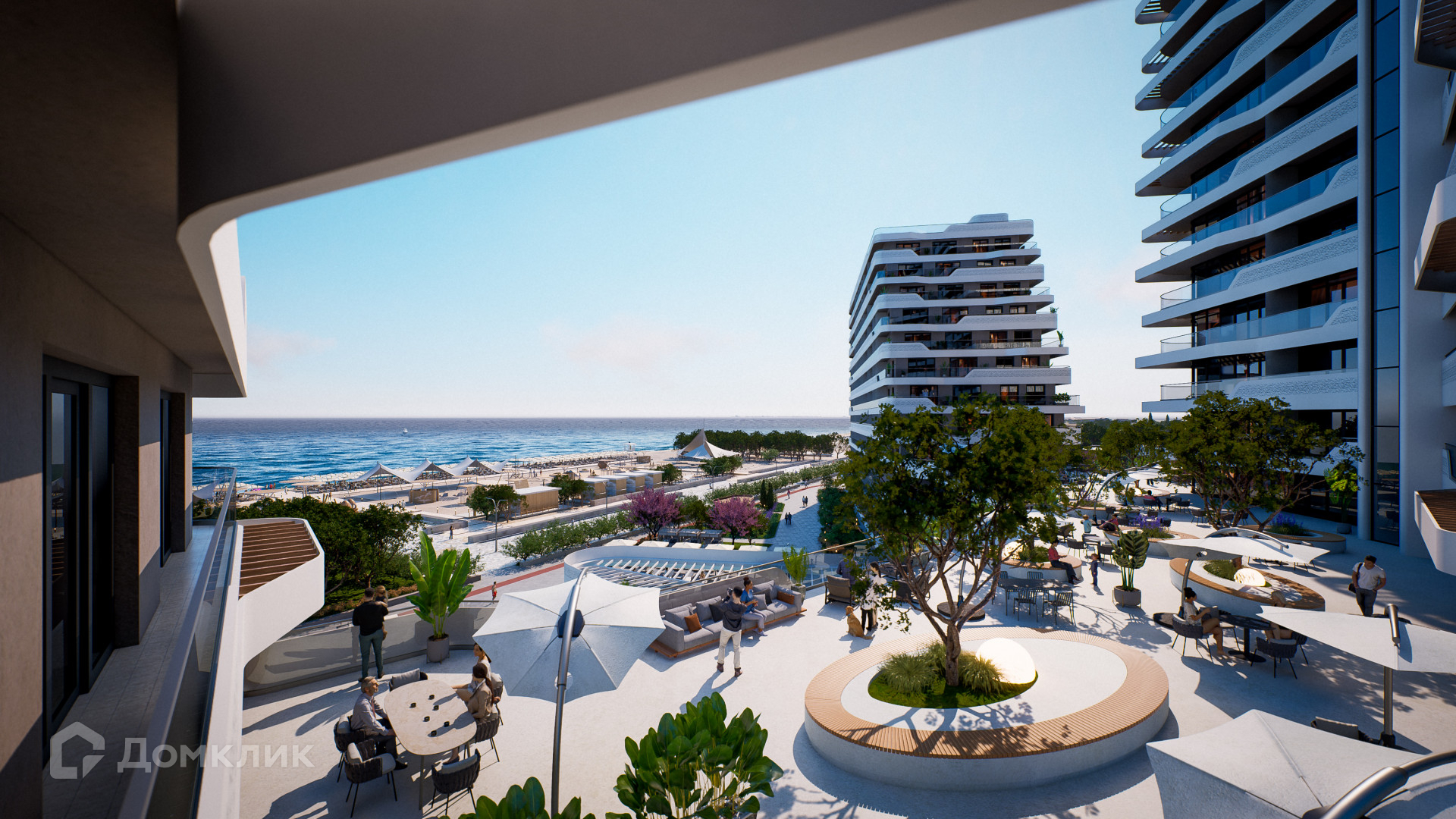 Планировка: прихожая с санузлом, кухня-студия, терраса с видом на море и парк.