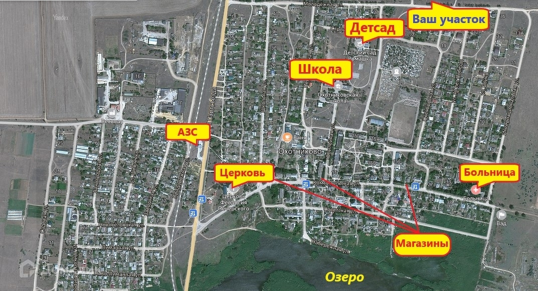 Село Охотниково большое с развитой инфраструктурой и удобной транспортной развязкой - маршрутки в город Саки ходят каждый 20 минут. В пешей доступности находятся: