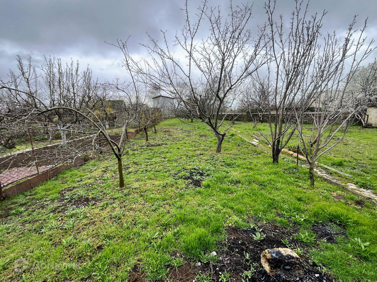 Участок правильной формы, ровный, с фруктовыми деревьями.