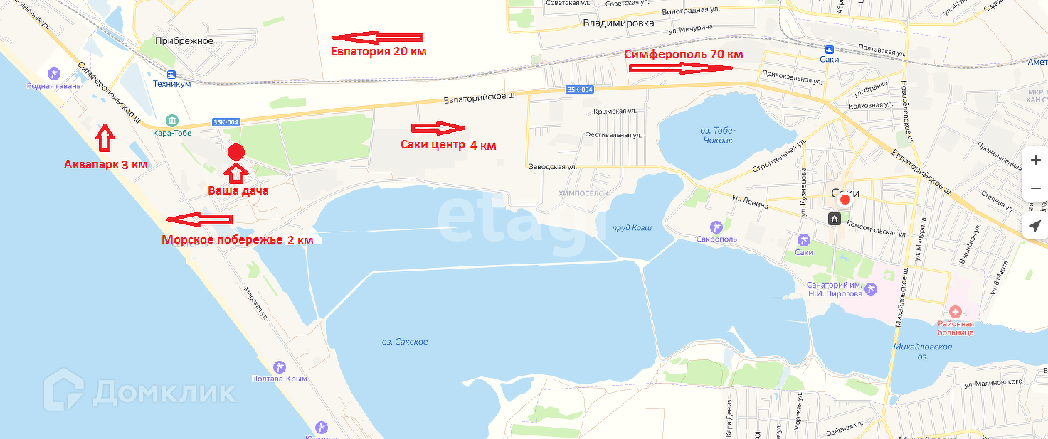 В настоящее время разрабатывается техническая документация по водоснабжению и подаче электроэнергии. Участок расположен в непосредственной близости к побережью, где сосредоточены, базы отдыха, аквапарк, аттракционы, магазины, кафе. До г Саки 5 км, до Симферополя 70 км, до Евпатории 20 км.