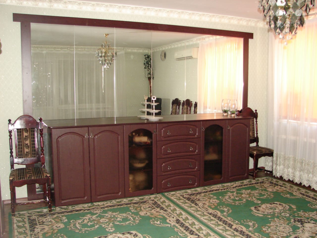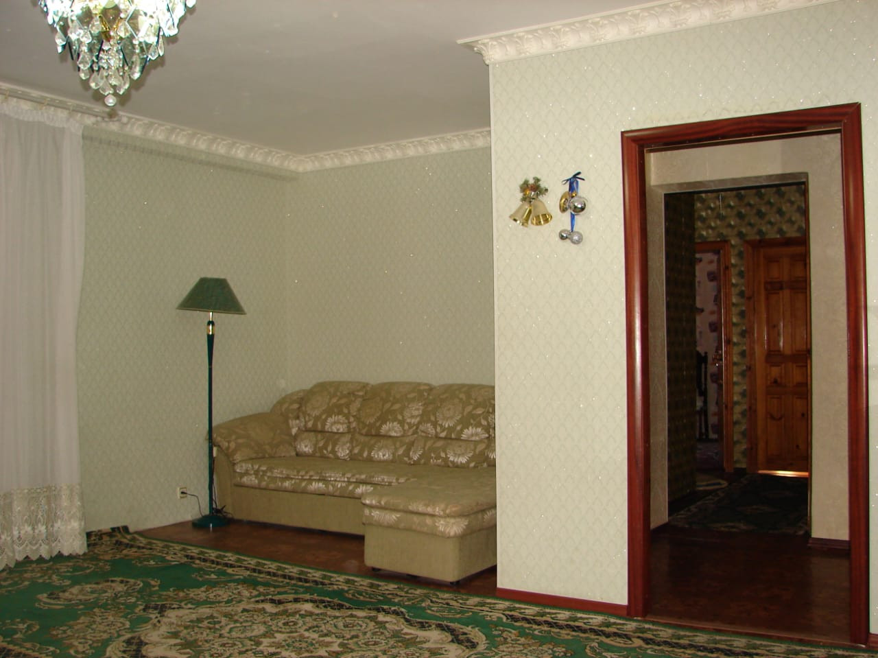 Сделана перепланировка из 5 ти комнатной квартиры: расширена кухня, зал объединен со спальней, санузел совмещен.